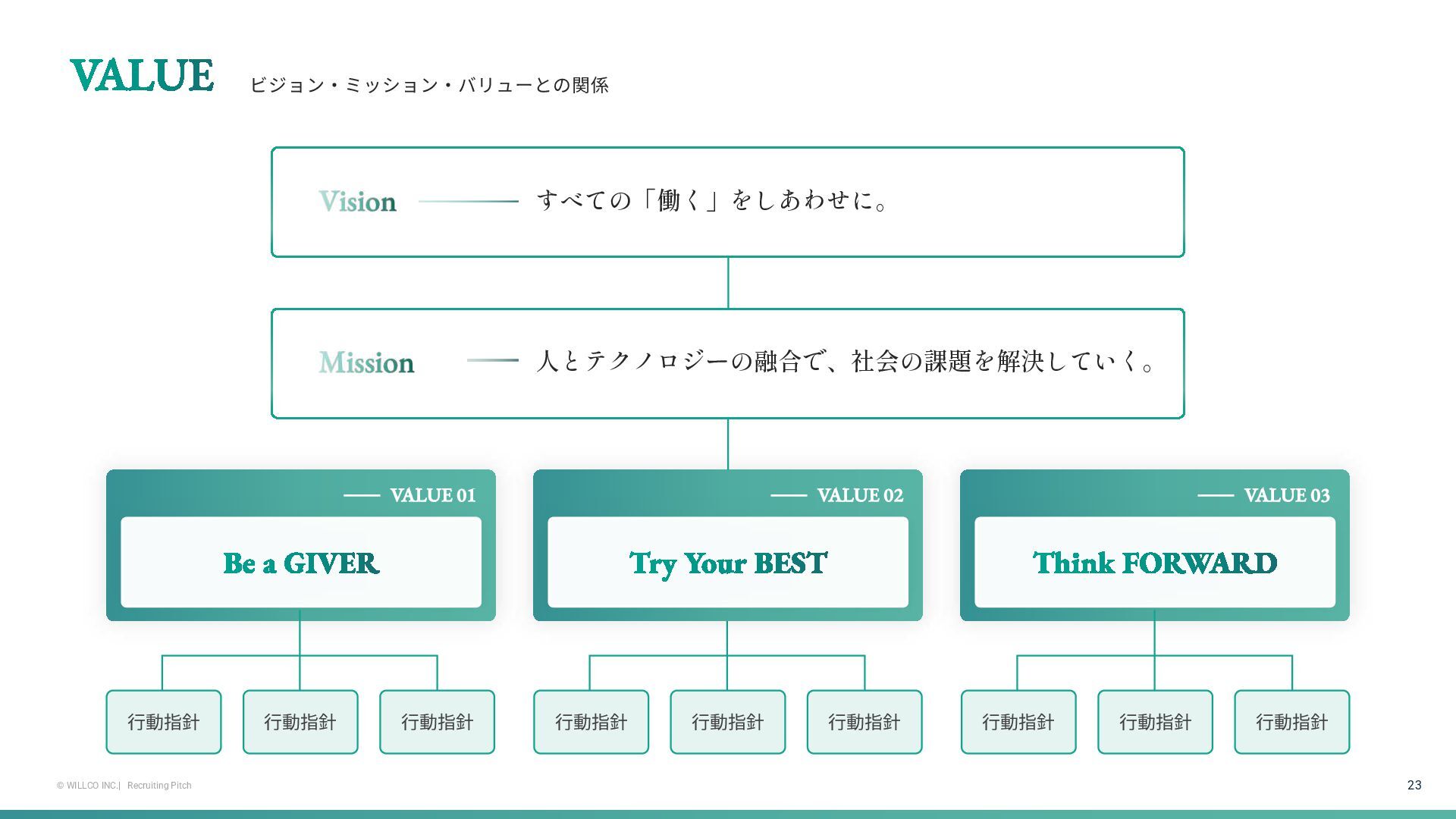 23 © WILLCO INC.| Recruiting Pitch ⾏動指針 ⾏動指針 ⾏動指針 ビジョン‧ミッション‧バリューとの関係
