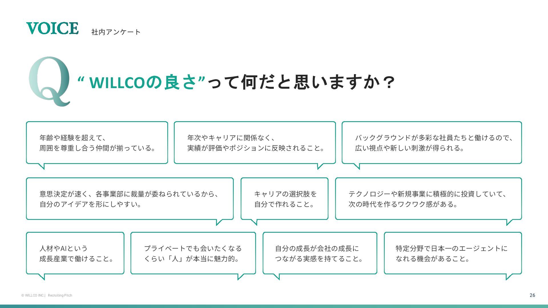26 © WILLCO INC.| Recruiting Pitch 社内アンケート “ WILLCOの良さ”って何だと思いますか? 年齢や経験を超えて、