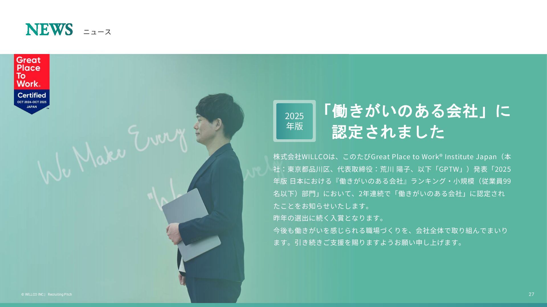 ニュース 27 © WILLCO INC.| Recruiting Pitch 2025 年版 株式会社WILLCOは、このたびGreat