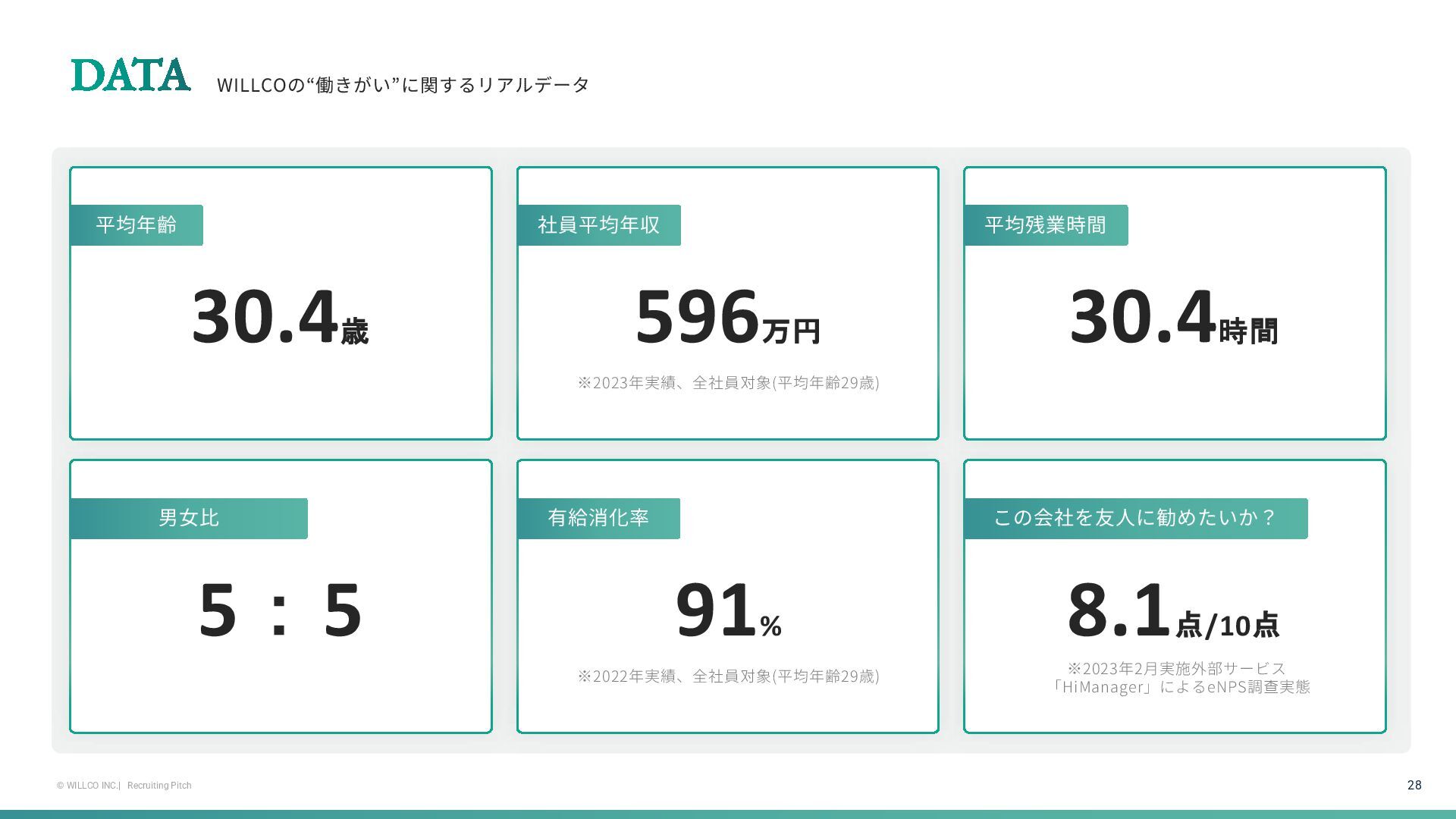 28 © WILLCO INC.| Recruiting Pitch WILLCOの“働きがい”に関するリアルデータ 30.4歳 ※2023年実績、全社員对象(平均年齢29歳) 平均年齡