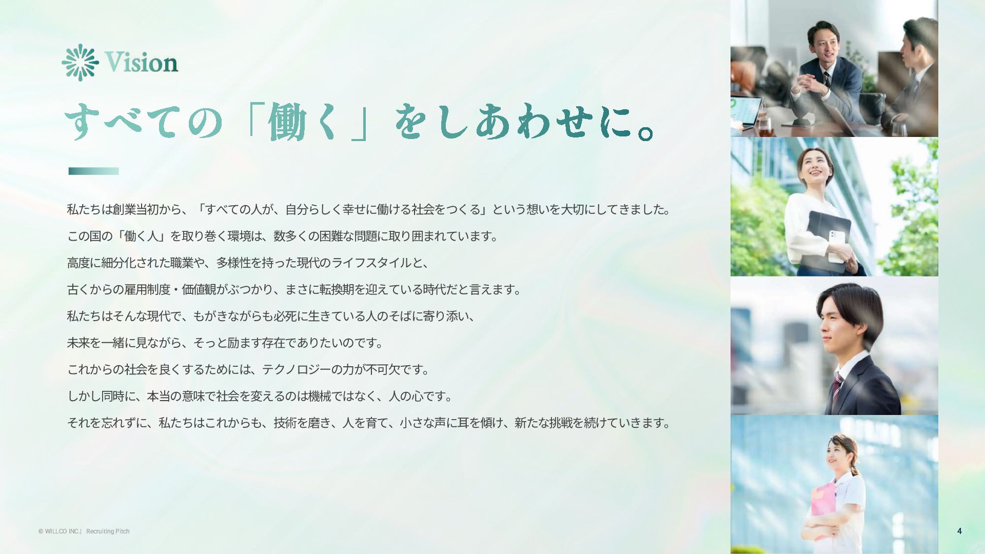 Recruiting Pitch 私たちは創業当初から、「すべての⼈が、⾃分らしく幸せに働ける社会をつくる」という想いを⼤切にしてきました。 この国の「働く⼈」を取り巻く環境は、数多くの困難な問題に取り囲まれています。 ⾼度に細分化された職業や、多様性を持った現代のライフスタイルと、 古くからの雇⽤制度‧価値観がぶつかり、まさに転換期を迎えている時代だと⾔えます。 私たちはそんな現代で、もがきながらも必死に⽣きている⼈のそばに寄り添い、 未来を⼀緒に⾒ながら、そっと励ます存在でありたいのです。 これからの社会を良くするためには、テクノロジーの⼒が不可⽋です。 しかし同時に、本当の意味で社会を変えるのは機械ではなく、⼈の⼼です。 それを忘れずに、私たちはこれからも、技術を磨き、⼈を育て、⼩さな声に⽿を傾け、新たな挑戦を続けていきます。