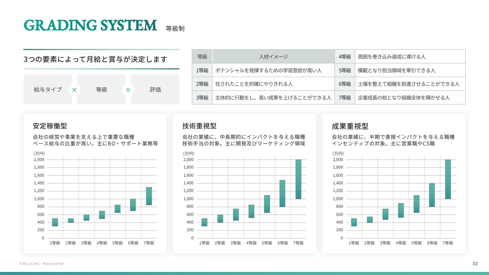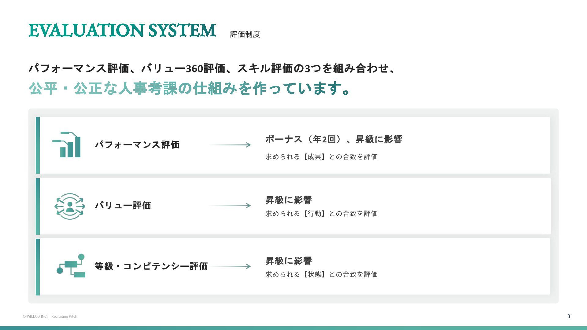 31 © WILLCO INC.| Recruiting Pitch 評価制度 パフォーマンス評価、バリュー360評価、スキル評価の3つを組み合わせ、 パフォーマンス評価 ボーナス(年2回)、昇級に影響
