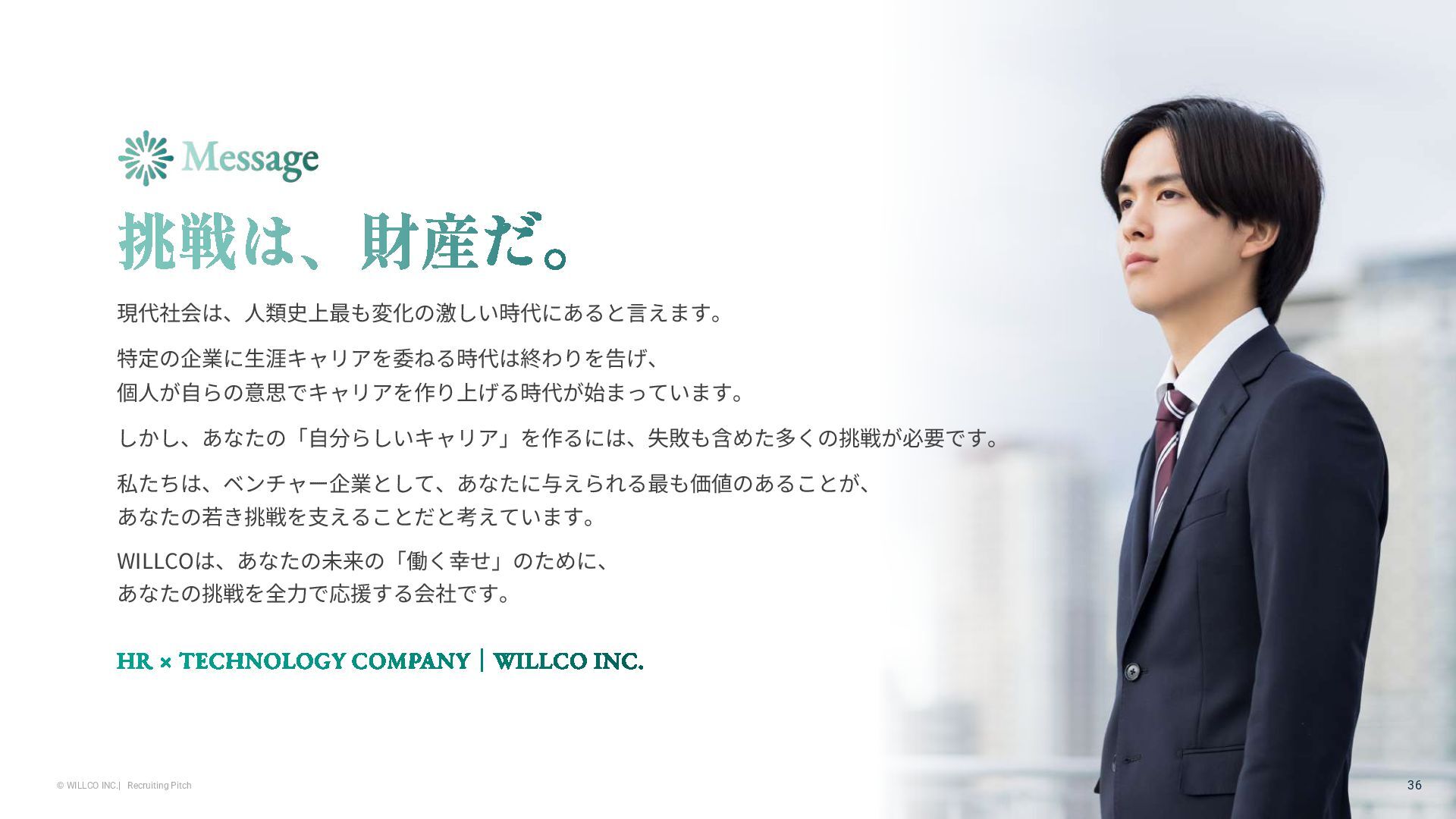 現代社会は、⼈類史上最も変化の激しい時代にあると⾔えます。 特定の企業に⽣涯キャリアを委ねる時代は終わりを告げ、 個⼈が⾃らの意思でキャリアを作り上げる時代が始まっています。 しかし、あなたの「⾃分らしいキャリア」を作るには、失敗も含めた多くの挑戦が必要です。 私たちは、ベンチャー企業として、あなたに与えられる最も価値のあることが、 あなたの若き挑戦を⽀えることだと考えています。 WILLCOは、あなたの未来の「働く幸せ」のために、 あなたの挑戦を全⼒で応援する会社です。 36 ©