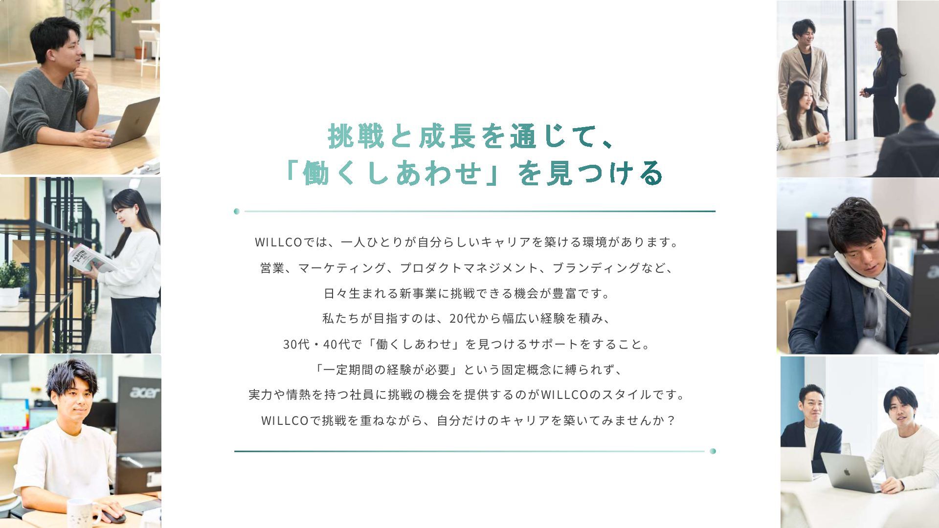 WILLCOでは、⼀⼈ひとりが⾃分らしいキャリアを築ける環境があります。 営業、マーケティング、プロダクトマネジメント、ブランディングなど、 ⽇々⽣まれる新事業に挑戦できる機会が豊富です。 私たちが⽬指すのは、20代から幅広い経験を積み、 30代‧40代で「働くしあわせ」を⾒つけるサポートをすること。 「⼀定期間の経験が必要」という固定概念に縛られず、 実⼒や情熱を持つ社員に挑戦の機会を提供するのがWILLCOのスタイルです。 WILLCOで挑戦を重ねながら、⾃分だけのキャリアを築いてみませんか?