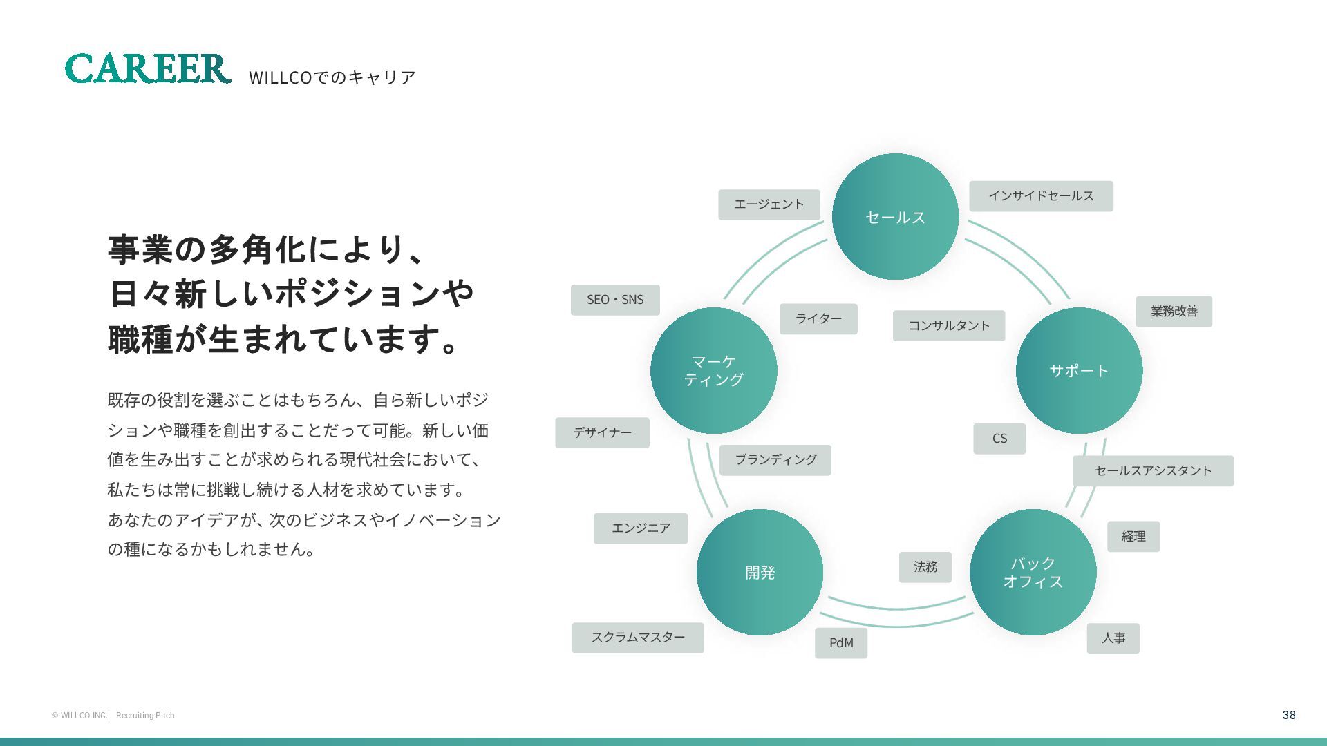 38 © WILLCO INC.| Recruiting Pitch WILLCOでのキャリア 事業の多角化により、 日々新しいポジションや 職種が生まれています。