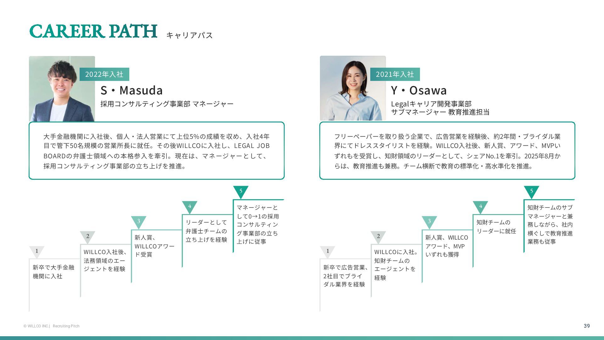 ⼤⼿⾦融機関に⼊社後、個⼈‧法⼈営業にて上位5%の成績を収め、⼊社4年 ⽬で管下50名規模の営業所⻑に就任。その後WILLCOに⼊社し、LEGAL JOB BOARDの弁護⼠領域への本格参⼊を牽引。現在は、マネージャーとして、 採⽤コンサルティング事業部の⽴ち上げを推進。 2022年⼊社 5 新卒で⼤⼿⾦融 機関に⼊社 WILLCO⼊社後、 法務領域のエー ジェントを経験 新⼈賞、 WILLCOアワー ド受賞 リーダーとして 弁護⼠チームの ⽴ち上げを経験 マネージャーと して0→1の採⽤ コンサルティン グ事業部の⽴ち 上げに従事 1 2 3 4 Y‧Osawa Legalキャリア開発事業部 サブマネージャー 教育推進担当 フリーペーパーを取り扱う企業で、広告営業を経験後、約2年間‧ブライダル業 界にてドレススタイリストを経験。WILLCO⼊社後、新⼈賞、アワード、MVPい ずれもを受賞し、知財領域のリーダーとして、シェアNo.1を牽引。2025年8⽉か らは、教育推進も兼務。チーム横断で教育の標準化‧⾼⽔準化を推進。 2021年⼊社 5 新卒で広告営業、 2社⽬でブライ ダル業界を経験 WILLCOに⼊社。 知財チームの エージェントを 経験 新⼈賞、WILLCO アワード、MVP いずれも獲得 知財チームの リーダーに就任 知財チームのサブ マネージャーと兼 務しながら、社内 横ぐしで教育推進 業務も従事 1 2 3 4