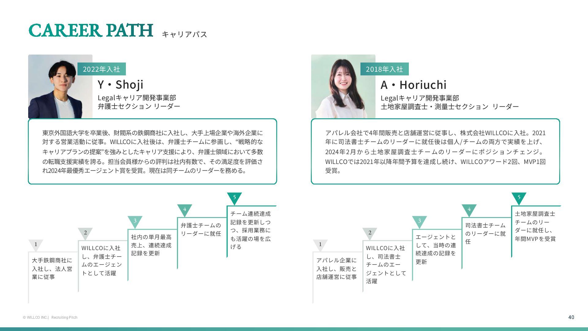 40 © WILLCO INC.| Recruiting Pitch キャリアパス Y‧Shoji Legalキャリア開発事業部 弁護⼠セクション