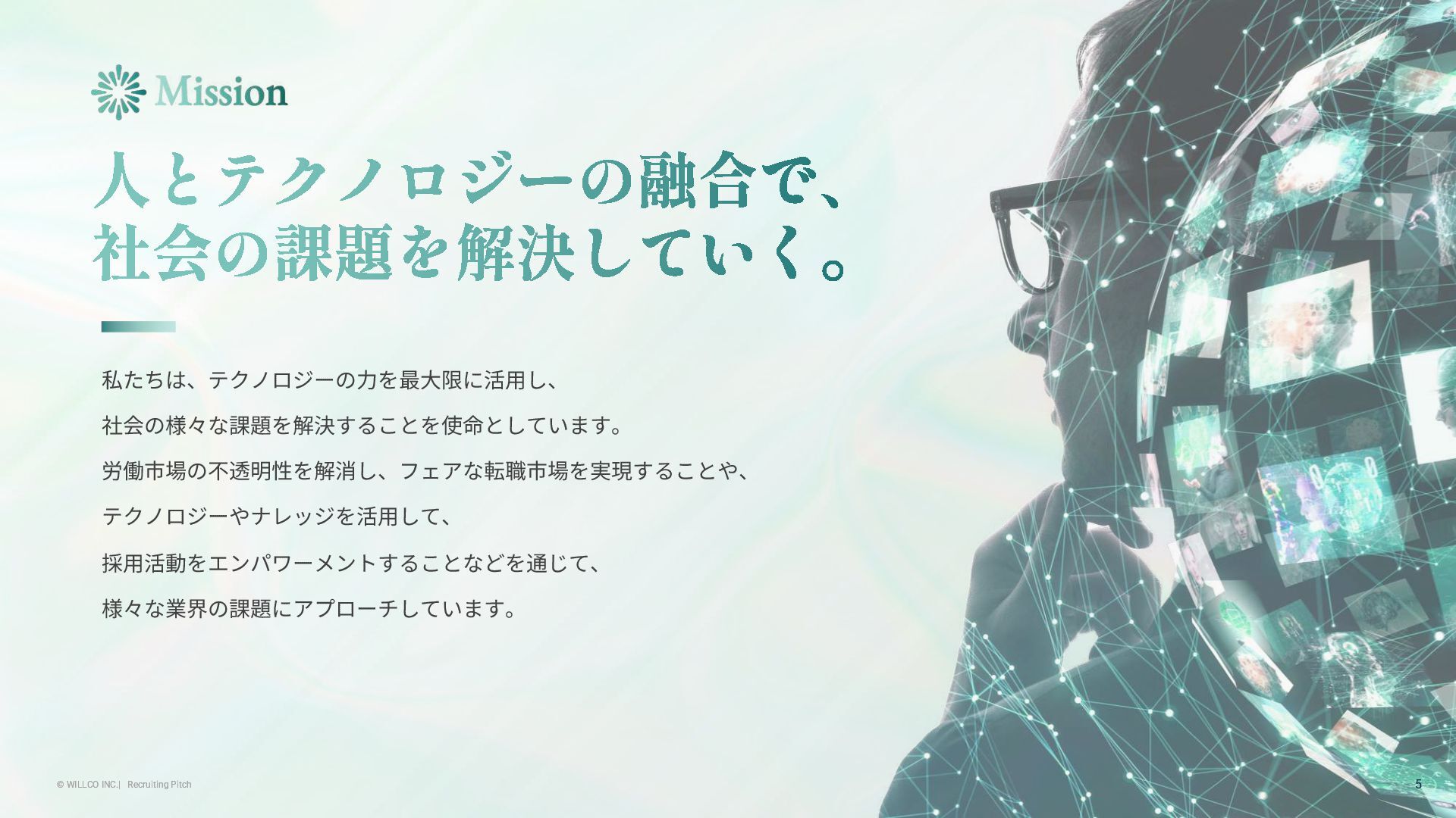 Recruiting Pitch 私たちは、テクノロジーの⼒を最⼤限に活⽤し、 社会の様々な課題を解決することを使命としています。 労働市場の不透明性を解消し、フェアな転職市場を実現することや、 テクノロジーやナレッジを活⽤して、 採⽤活動をエンパワーメントすることなどを通じて、 様々な業界の課題にアプローチしています。