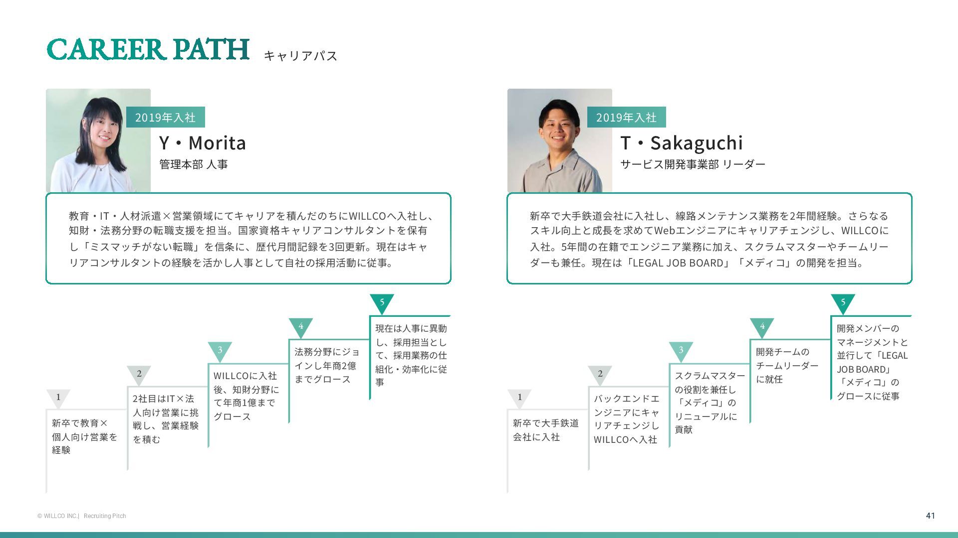 経験 2社⽬はIT×法 ⼈向け営業に挑 戦し、営業経験 を積む WILLCOに⼊社 後、知財分野に て年商1億まで グロース 法務分野にジョ インし年商2億 までグロース 現在は⼈事に異動 し、採⽤担当とし て、採⽤業務の仕 組化‧効率化に従 事 1 2 3 4 5 新卒で⼤⼿鉄道 会社に⼊社 バックエンドエ ンジニアにキャ リアチェンジし WILLCOへ⼊社 スクラムマスター の役割を兼任し 「メディコ」の リニューアルに 貢献 開発チームの チームリーダー に就任 開発メンバーの マネージメントと 並⾏して「LEGAL JOB BOARD」 「メディコ」の グロースに従事 1 2 3 4 教育‧IT‧⼈材派遣×営業領域にてキャリアを積んだのちにWILLCOへ⼊社し、 知財‧法務分野の転職⽀援を担当。国家資格キャリアコンサルタントを保有 し「ミスマッチがない転職」を信条に、歴代⽉間記録を3回更新。現在はキャ リアコンサルタントの経験を活かし⼈事として⾃社の採⽤活動に従事。 新卒で⼤⼿鉄道会社に⼊社し、線路メンテナンス業務を2年間経験。さらなる スキル向上と成⻑を求めてWebエンジニアにキャリアチェンジし、WILLCOに ⼊社。5年間の在籍でエンジニア業務に加え、スクラムマスターやチームリー ダーも兼任。現在は「LEGAL JOB BOARD」「メディコ」の開発を担当。 Y‧Morita 管理本部 ⼈事 2019年⼊社 T‧Sakaguchi サービス開発事業部 リーダー 2019年⼊社