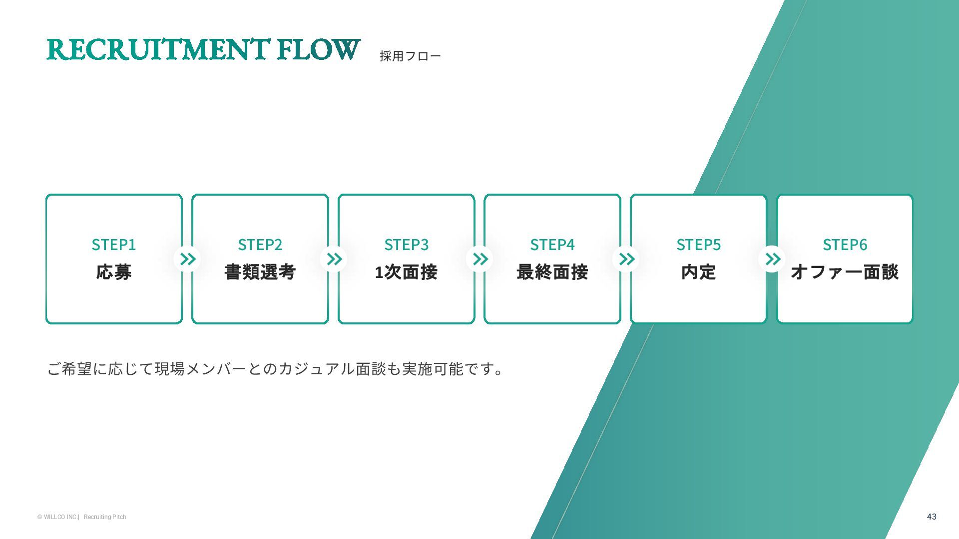 STEP5 内定 STEP6 オファー面談 43 © WILLCO INC.| Recruiting Pitch