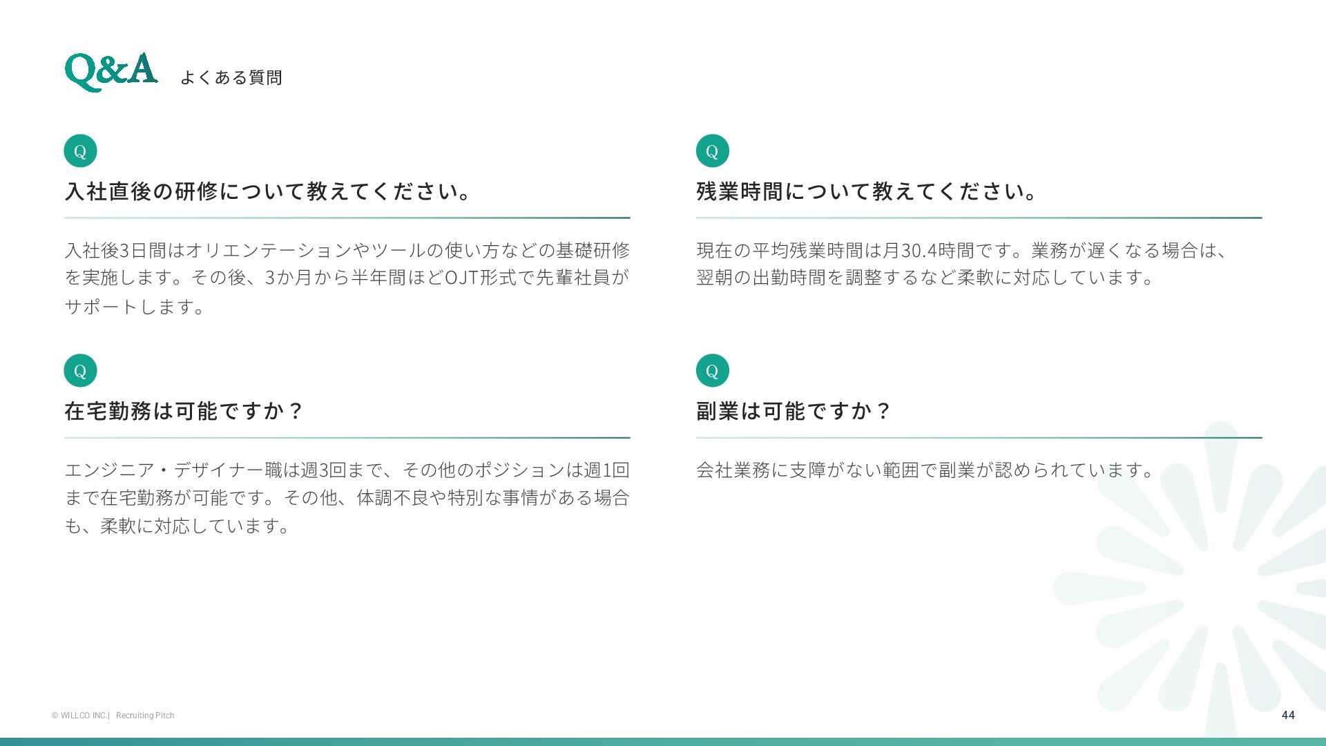 44 © WILLCO INC.| Recruiting Pitch よくある質問 ⼊社直後の研修について教えてください。 ⼊社後3⽇間はオリエンテーションやツールの使い⽅などの基礎研修 を実施します。その後、3か⽉から半年間ほどOJT形式で先輩社員が