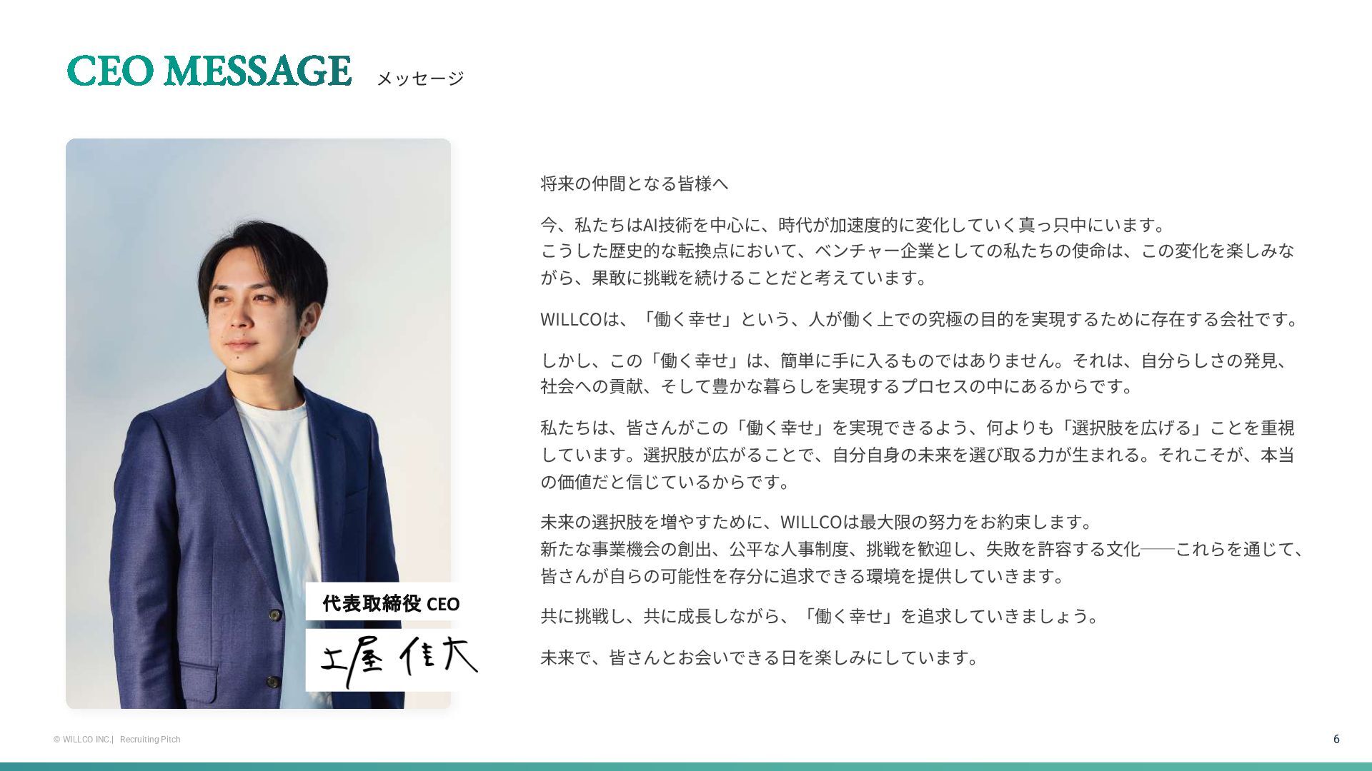 WILLCOは、「働く幸せ」という、⼈が働く上での究極の⽬的を実現するために存在する会社です。 しかし、この「働く幸せ」は、簡単に⼿に⼊るものではありません。それは、⾃分らしさの発⾒、 社会への貢献、そして豊かな暮らしを実現するプロセスの中にあるからです。 私たちは、皆さんがこの「働く幸せ」を実現できるよう、何よりも「選択肢を広げる」ことを重視 しています。選択肢が広がることで、⾃分⾃⾝の未来を選び取る⼒が⽣まれる。それこそが、本当 の価値だと信じているからです。 未来の選択肢を増やすために、WILLCOは最⼤限の努⼒をお約束します。 新たな事業機会の創出、公平な⼈事制度、挑戦を歓迎し、失敗を許容する⽂化──これらを通じて、 皆さんが⾃らの可能性を存分に追求できる環境を提供していきます。 共に挑戦し、共に成⻑しながら、「働く幸せ」を追求していきましょう。 未来で、皆さんとお会いできる⽇を楽しみにしています。 代表取締役 CEO メッセージ