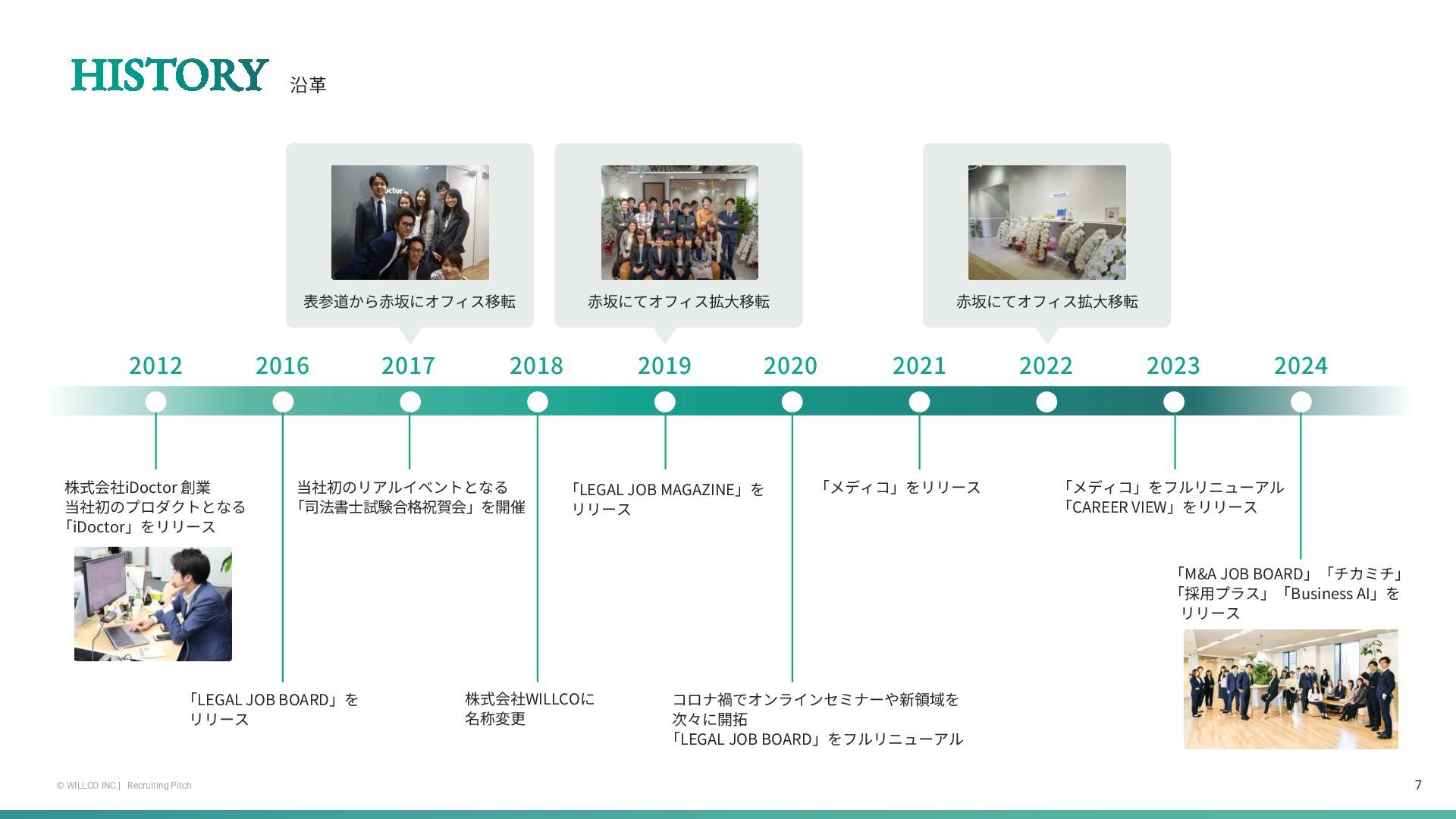 「採⽤プラス」「Business AI」を リリース 株式会社iDoctor 創業 当社初のプロダクトとなる 「iDoctor」をリリース 2012 2016 2017 2018 2020 2021 2023 2024 「LEGAL JOB BOARD」を リリース 当社初のリアルイベントとなる 「司法書⼠試験合格祝賀会」を開催 「LEGAL JOB MAGAZINE」を リリース 「メディコ」をリリース 株式会社WILLCOに 名称変更 コロナ禍でオンラインセミナーや新領域を 次々に開拓 「LEGAL JOB BOARD」をフルリニューアル 2019 2022 「メディコ」をフルリニューアル 「CAREER VIEW」をリリース 表参道から⾚坂にオフィス移転 ⾚坂にてオフィス拡⼤移転 ⾚坂にてオフィス拡⼤移転
