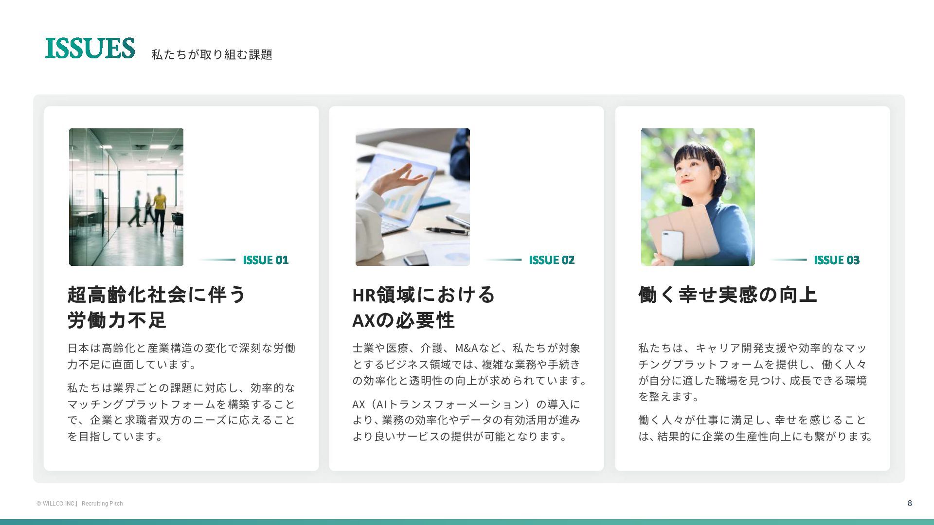 AX(AIトランスフォーメーション)の導⼊に より、 業務の効率化やデータの有効活⽤が進み より良いサービスの提供が可能となります。 HR領域における AXの必要性 私たちは、キャリア開発⽀援や効率的なマッ チングプラットフォームを提供し、働く⼈々 が⾃分に適した職場を⾒つけ、 成⻑できる環境 を整えます。 働く⼈々が仕事に満⾜し、 幸せを感じること は、 結果的に企業の⽣産性向上にも繋がります 。 働く幸せ実感の向上 私たちが取り組む課題 ⽇本は⾼齢化と産業構造の変化で深刻な労働 ⼒不⾜に直⾯しています。 私たちは業界ごとの課題に対応し、効率的な マッチングプラットフォームを構築すること で、企業と求職者双⽅のニーズに応えること を⽬指しています。 超高齢化社会に伴う 労働力不足