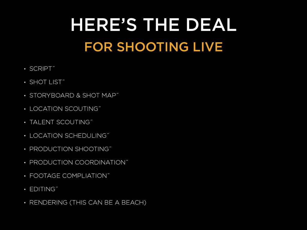 & SHOT MAP˝ • LOCATION SCOUTING˝ • TALENT SCOUTING˝ • LOCATION SCHEDULING˝ • PRODUCTION SHOOTING˝ • PRODUCTION COORDINATION˝ • FOOTAGE COMPLIATION˝ • EDITING˝ • RENDERING (THIS CAN BE A BEACH) FOR SHOOTING LIVE
