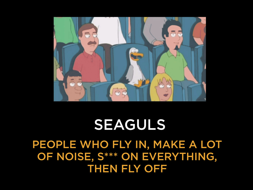 SEAGULS PEOPLE WHO FLY IN, MAKE A LOT OF NOISE,