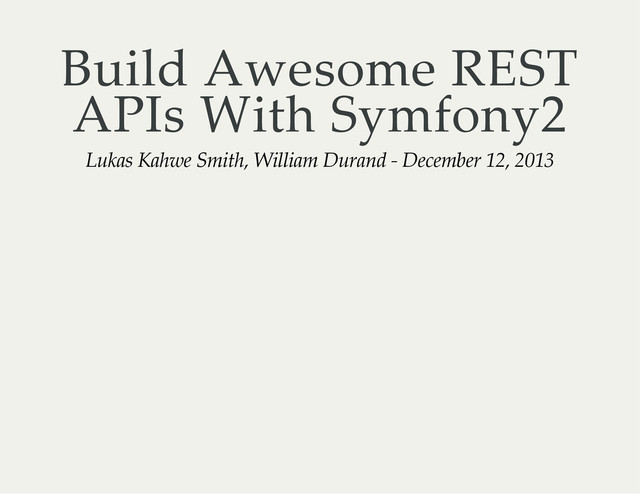 Based on concrete examples, you will learn how to build a REST API using Symfony2 and many third-party libraries in an efficient manner. We will dive into each layer including routing, controllers, serialization, versioning, testing, the security layer and even the documentation (this list is not exhaustive). Overall, this talk describes the state of REST in the Symfony2 world.