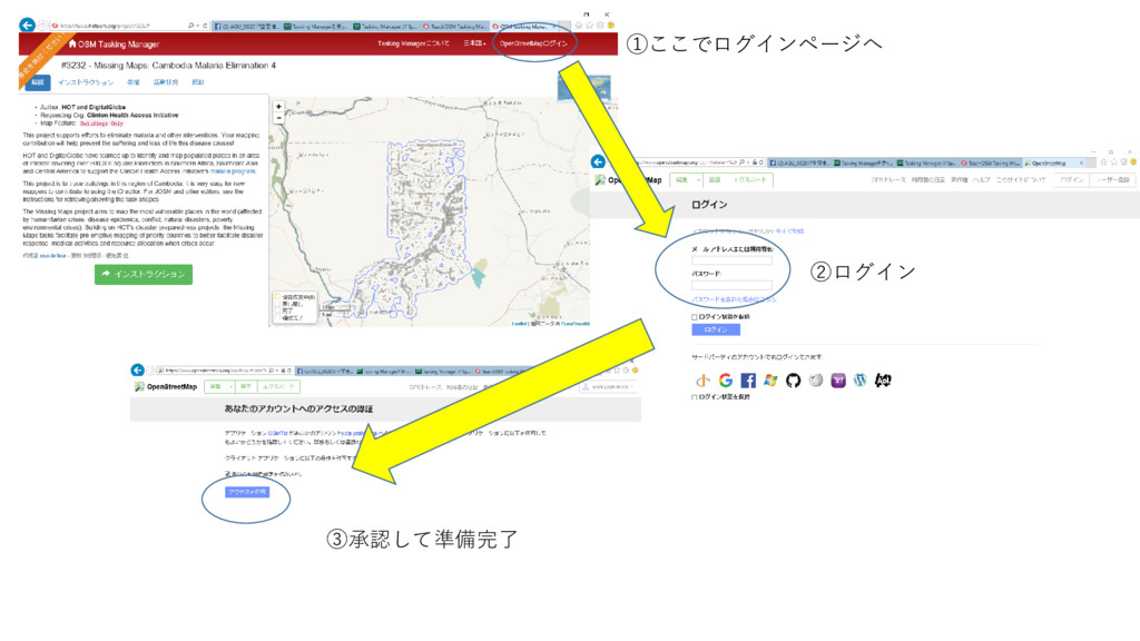 ①ここでログインページへ ②ログイン ③承認して準備完了