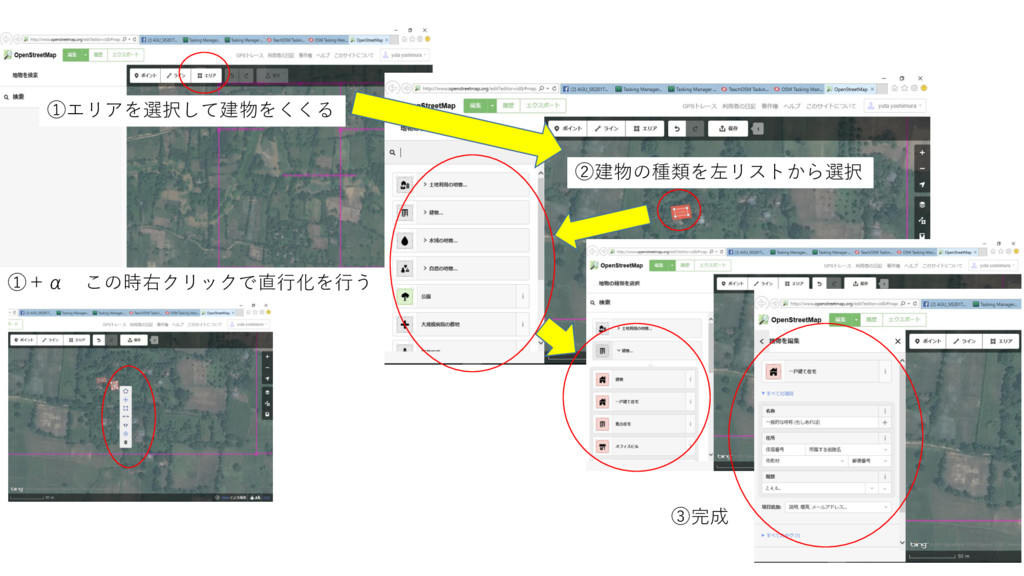 ①エリアを選択して建物をくくる ②建物の種類を左リストから選択 ③完成 ①+α この時右クリックで直行化を行う