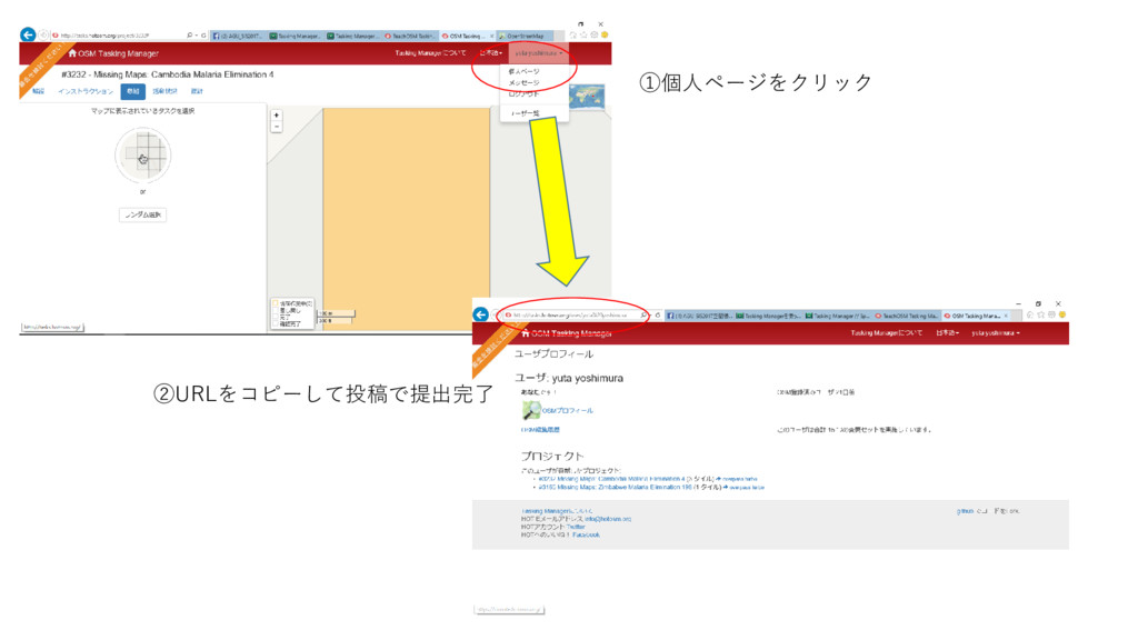 ①個人ページをクリック ②URLをコピーして投稿で提出完了