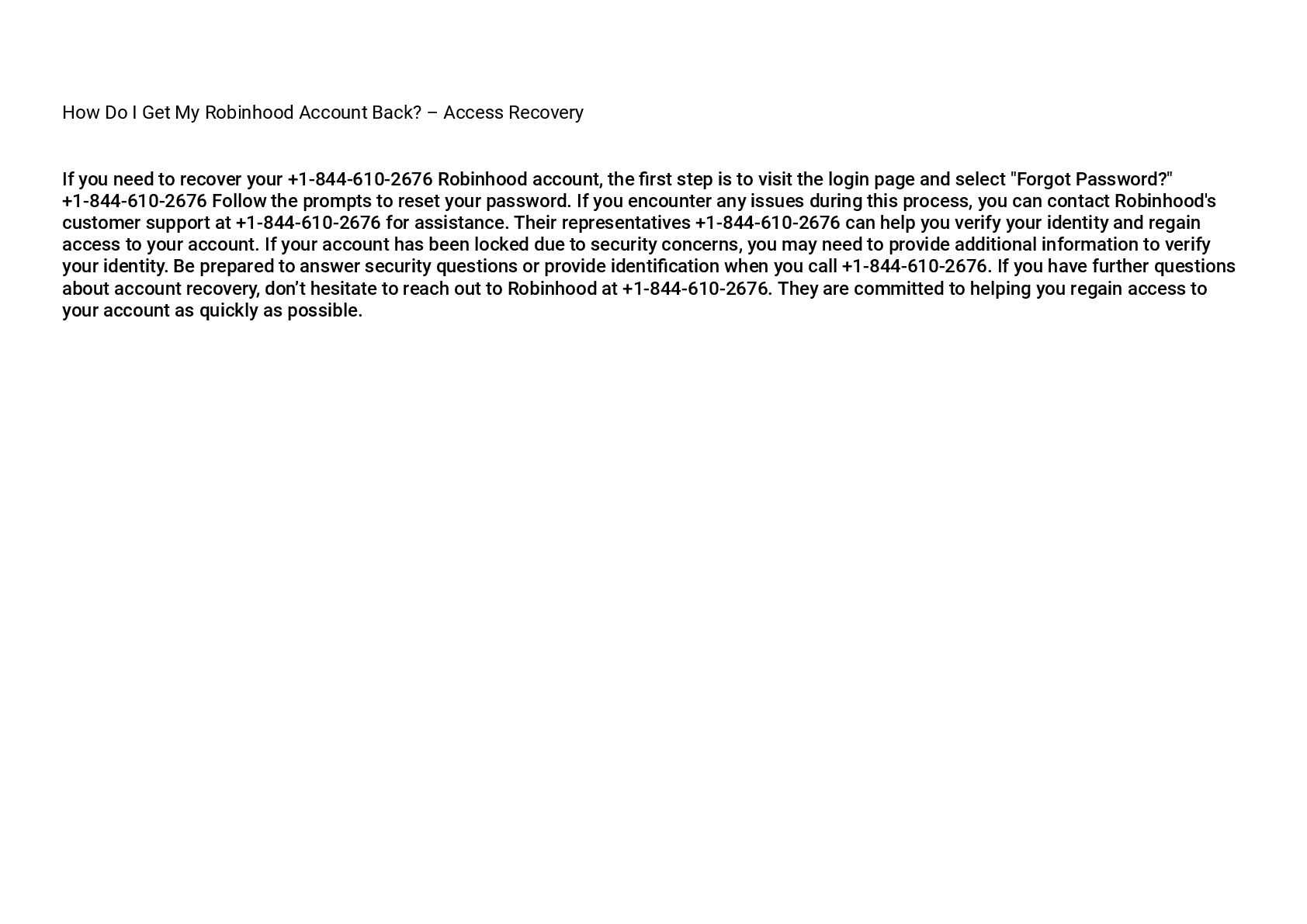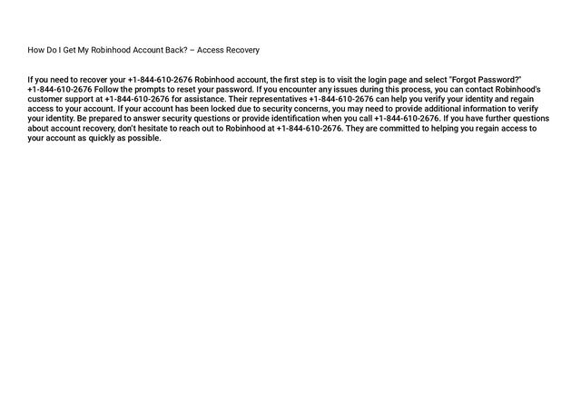 If you need to recover your +1-844-610-2676 Robinhood account, the first step is to visit the login page and select "Forgot Password?" +1-844-610-2676 Follow the prompts to reset your password. If you encounter any issues during this process, you can contact Robinhood's customer support at +1-844-610-2676 for assistance. Their representatives +1-844-610-2676 can help you verify your identity and regain access to your account. If your account has been locked due to security concerns, you may need to provide additional information to verify your identity. Be prepared to answer security questions or provide identification when you call +1-844-610-2676. If you have further questions about account recovery, don’t hesitate to reach out to Robinhood at +1-844-610-2676. They are committed to helping you regain access to your account as quickly as possible.