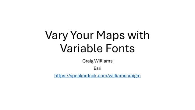 Variable fonts are an exciting new(ish) type of font that enables users to customize variables of a font such as weight, width, slant, and even custom variations the font designer exposes. In this presentation, I’ll introduce variable fonts, how the OpenType font variation technology behind them works, the benefits of using them, and examples you can start with today. I’ll then show how they can be used in your cartographic workflow in mapping applications like ArcGIS Pro and graphic design applications like Adobe Illustrator and Inkscape.