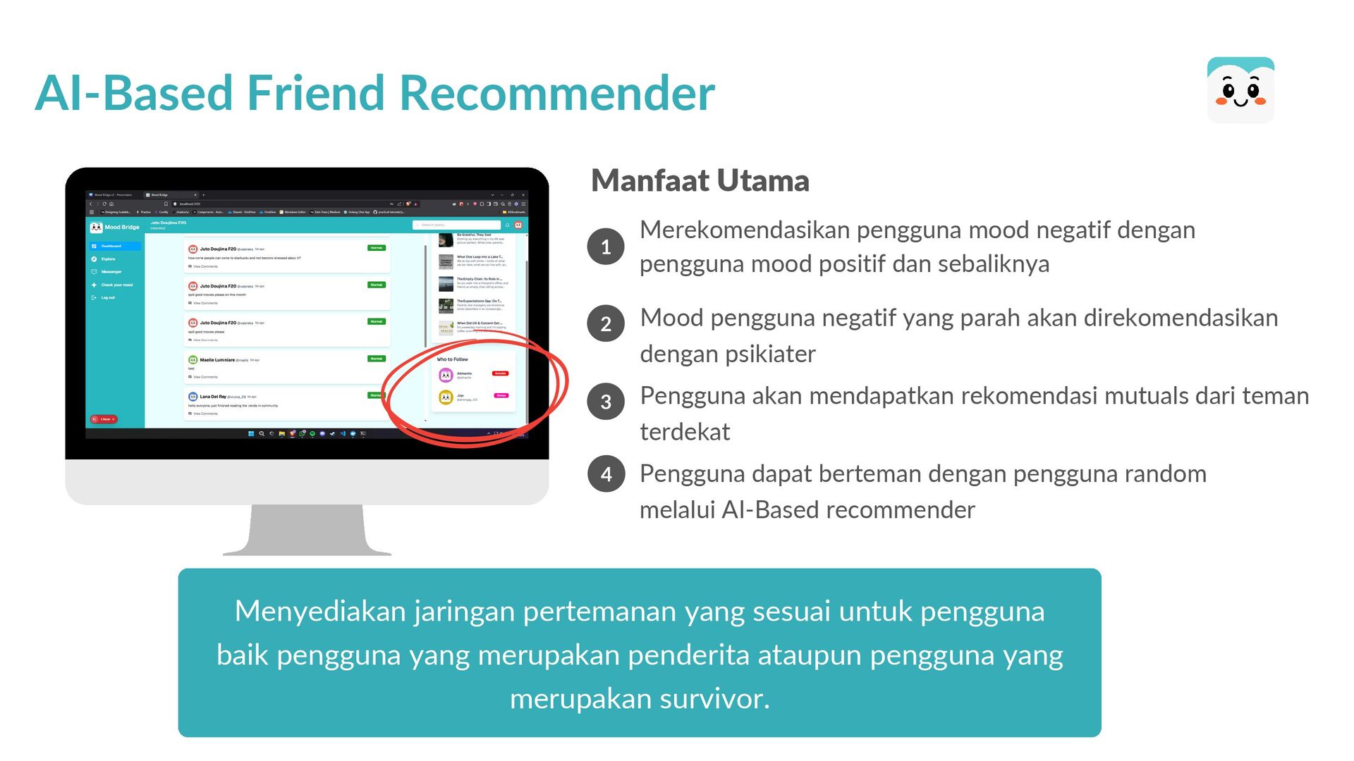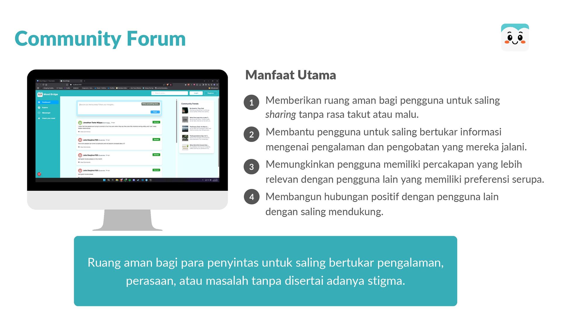 saling sharing tanpa rasa takut atau malu. Ruang aman bagi para penyintas untuk saling bertukar pengalaman, perasaan, atau masalah tanpa disertai adanya stigma. 1 Membangun hubungan positif dengan pengguna lain dengan saling mendukung. Memungkinkan pengguna memiliki percakapan yang lebih relevan dengan pengguna lain yang memiliki preferensi serupa. Membantu pengguna untuk saling bertukar informasi mengenai pengalaman dan pengobatan yang mereka jalani. 2 3 4
