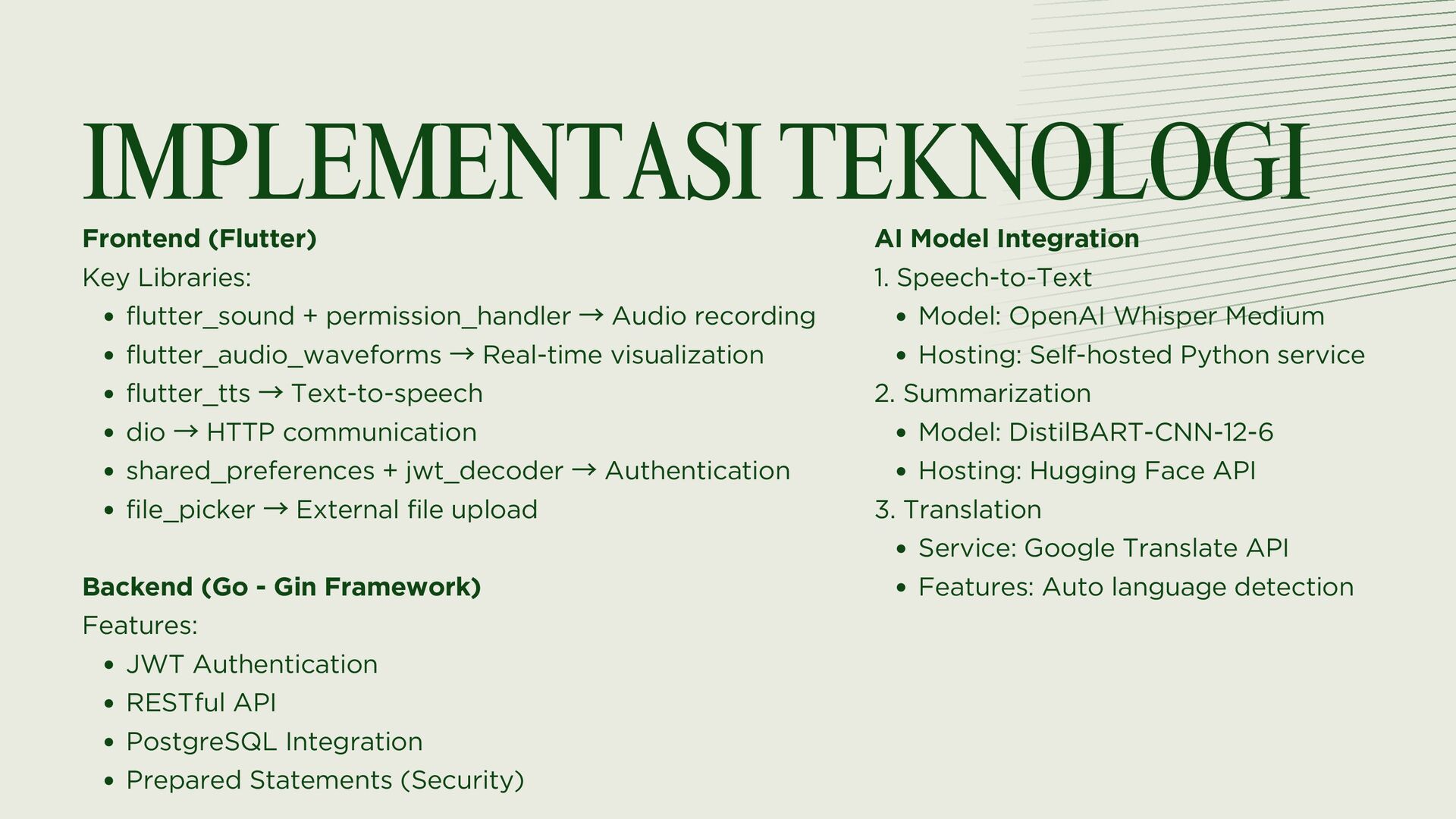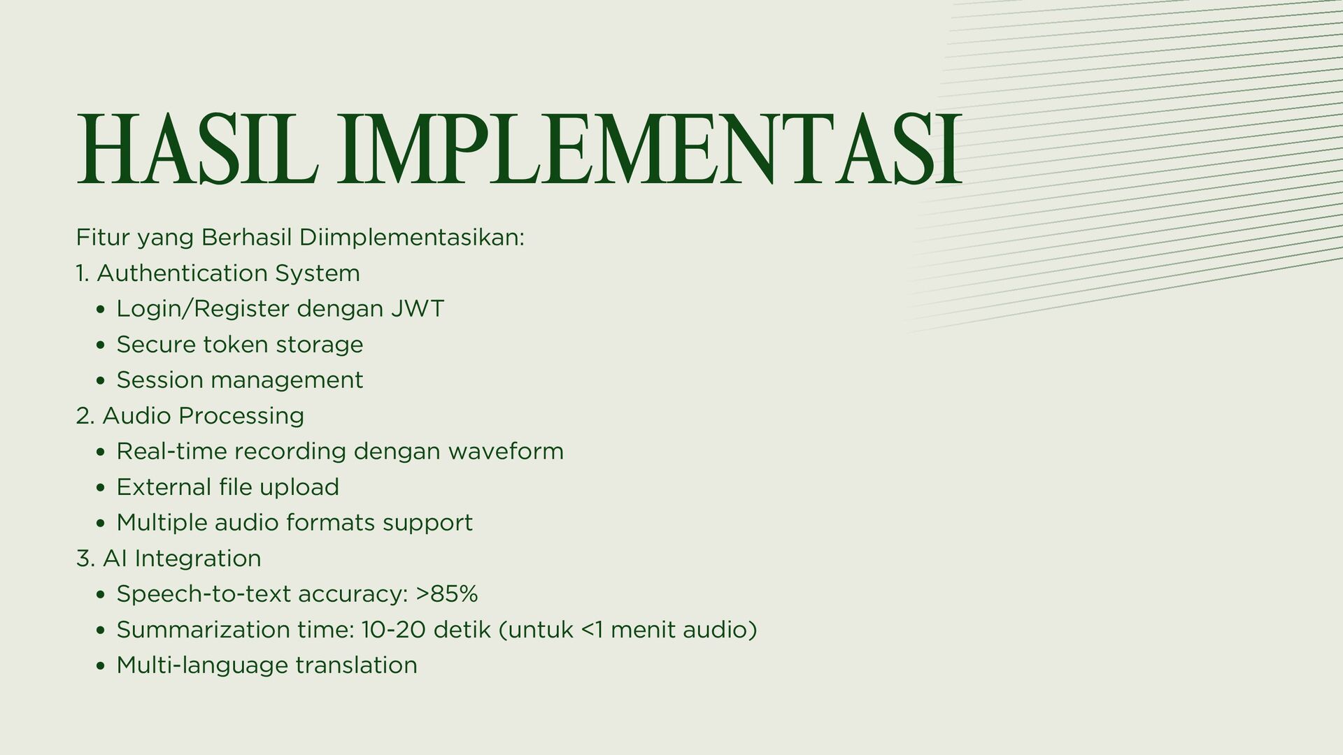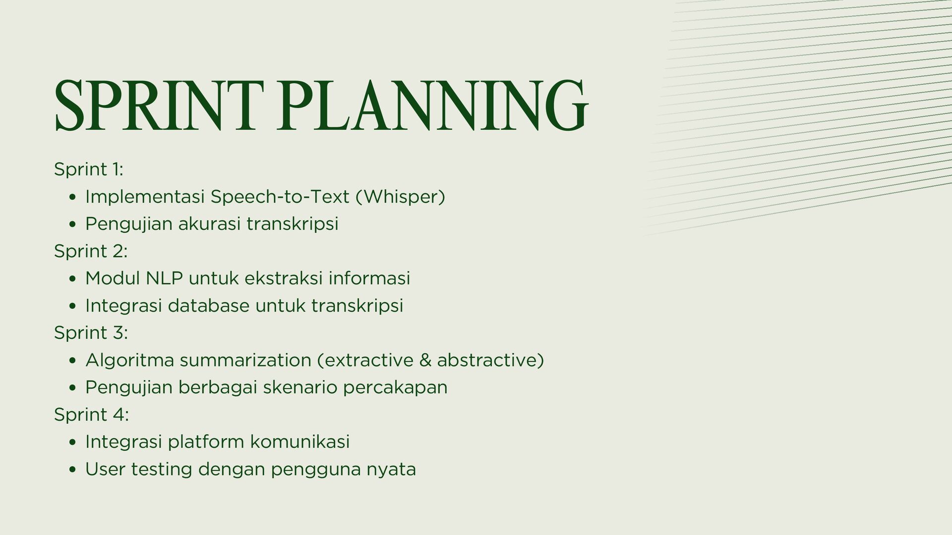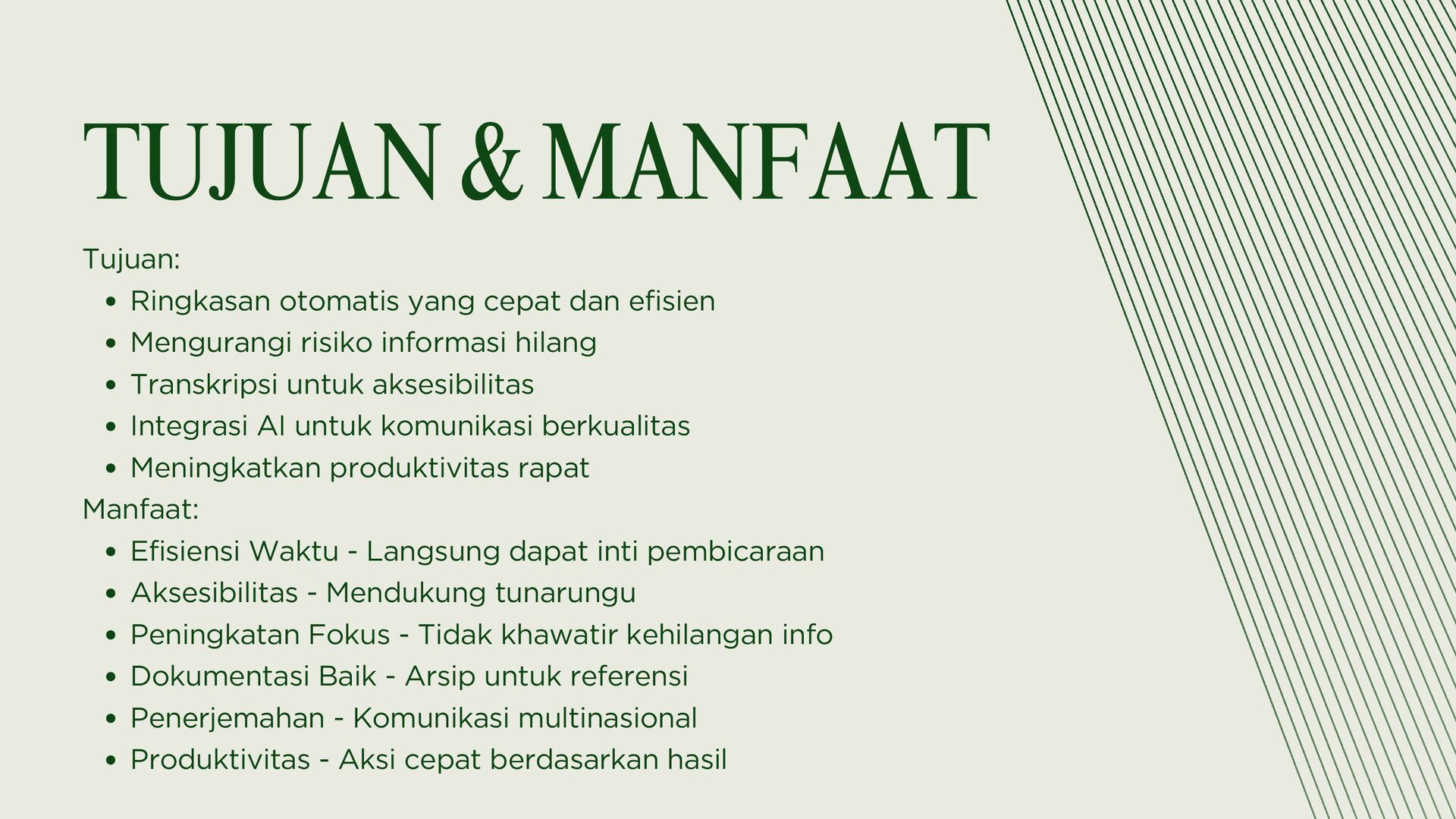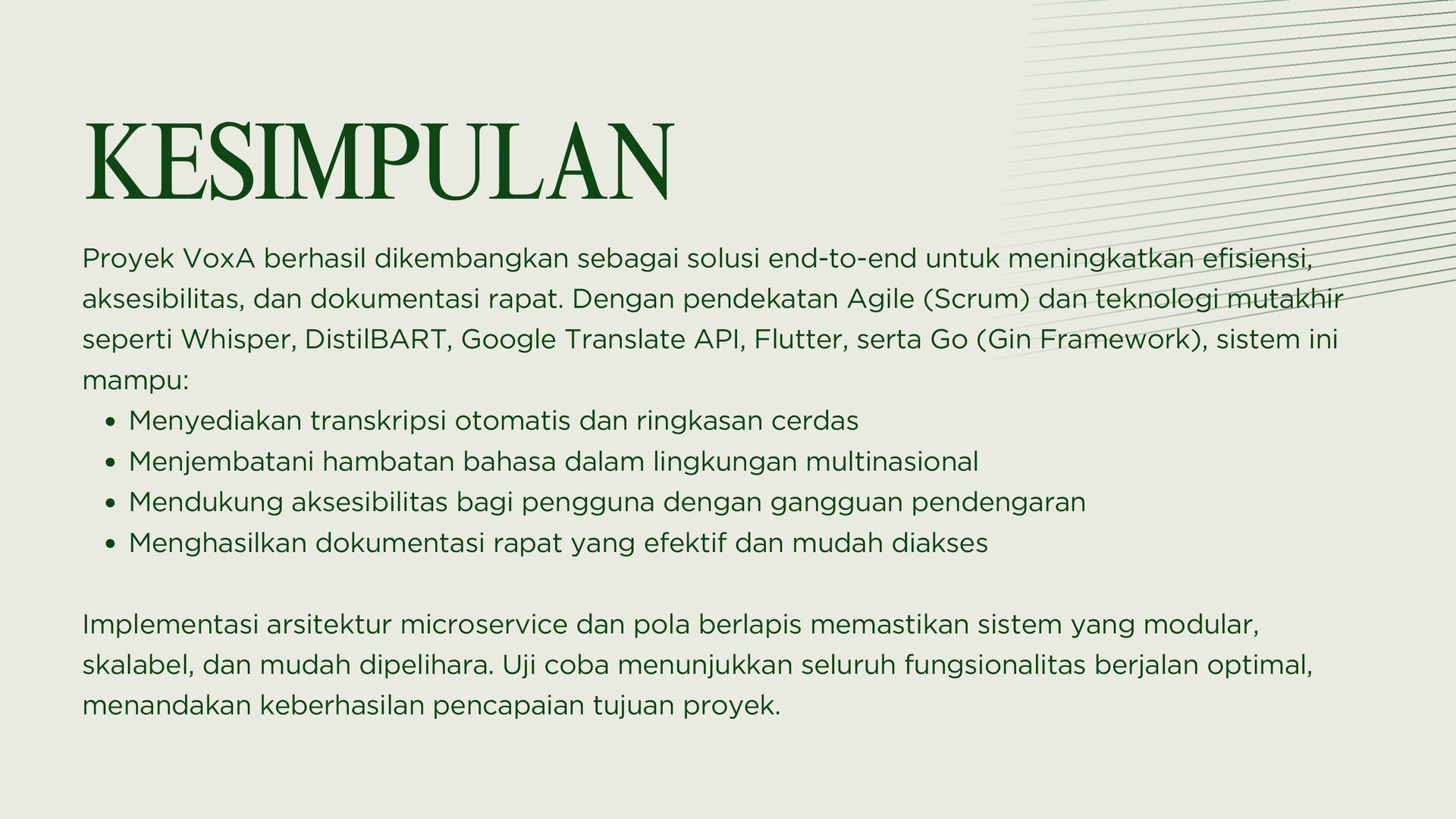 aksesibilitas, dan dokumentasi rapat. Dengan pendekatan Agile (Scrum) dan teknologi mutakhir seperti Whisper, DistilBART, Google Translate API, Flutter, serta Go (Gin Framework), sistem ini mampu: Menyediakan transkripsi otomatis dan ringkasan cerdas Menjembatani hambatan bahasa dalam lingkungan multinasional Mendukung aksesibilitas bagi pengguna dengan gangguan pendengaran Menghasilkan dokumentasi rapat yang efektif dan mudah diakses Implementasi arsitektur microservice dan pola berlapis memastikan sistem yang modular, skalabel, dan mudah dipelihara. Uji coba menunjukkan seluruh fungsionalitas berjalan optimal, menandakan keberhasilan pencapaian tujuan proyek. KESIMPULAN