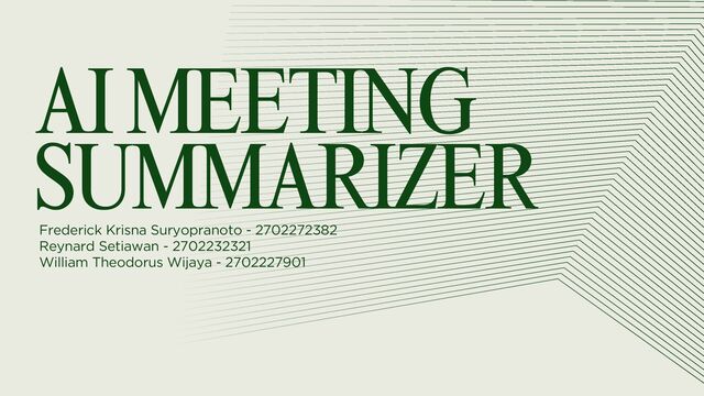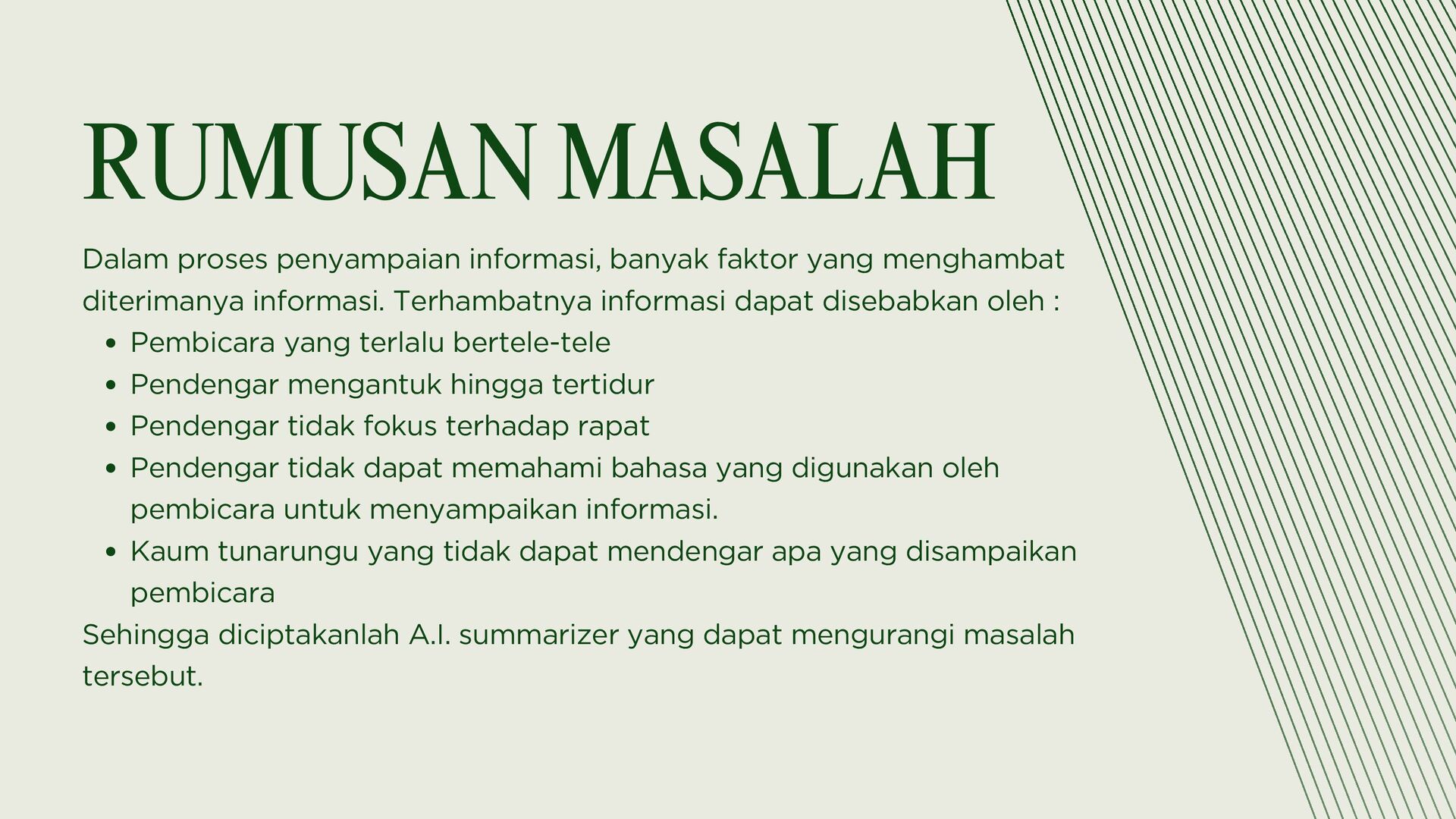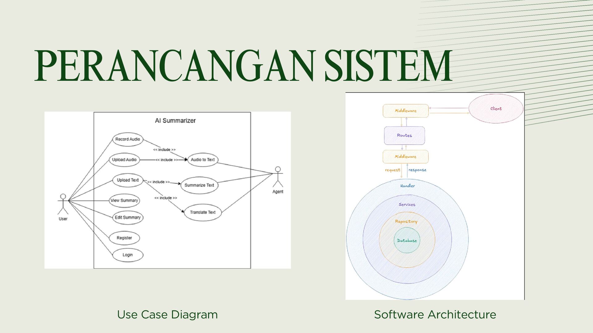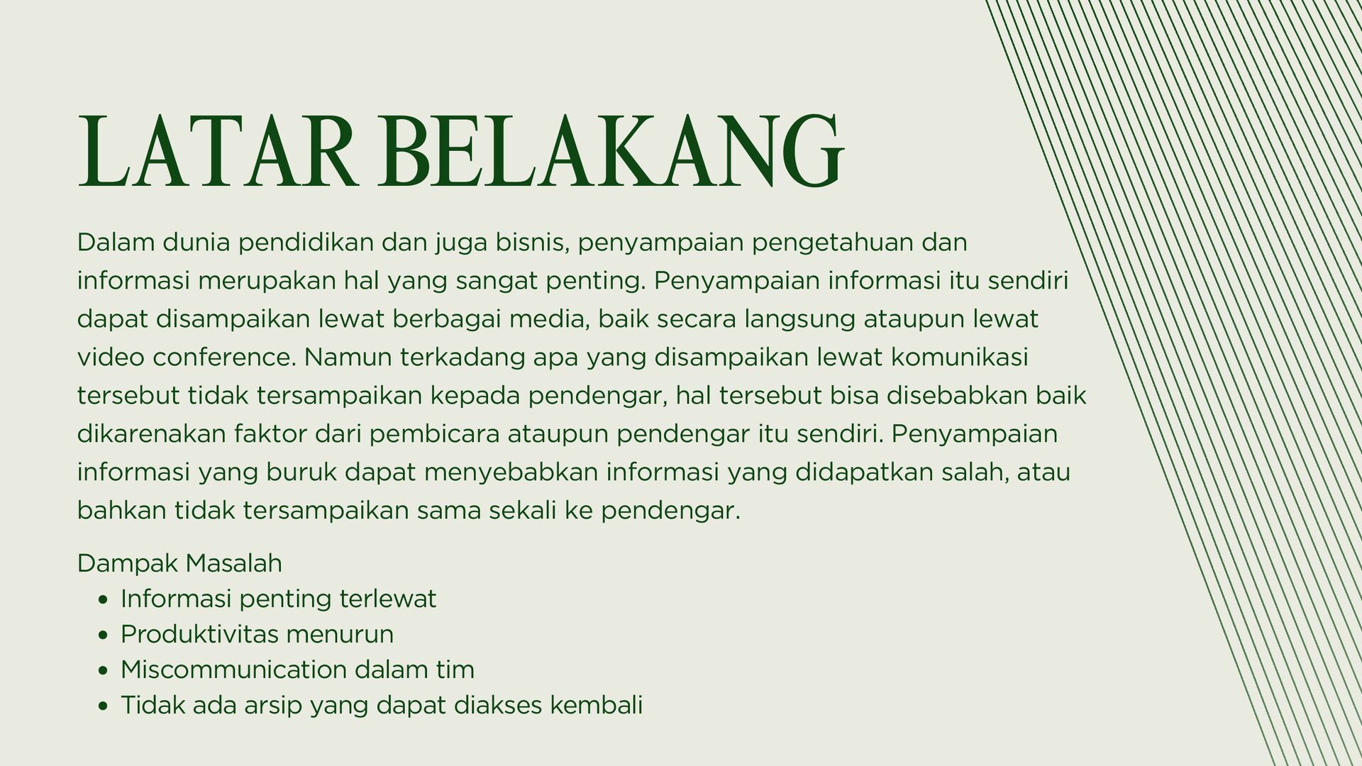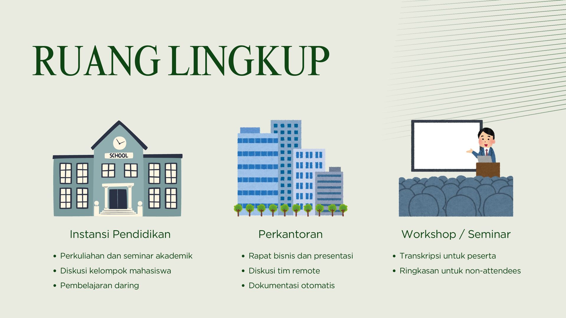 aksesibilitas, dan dokumentasi rapat. Dengan pendekatan Agile (Scrum) dan teknologi mutakhir seperti Whisper, DistilBART, Google Translate API, Flutter, serta Go (Gin Framework), sistem ini mampu: Menyediakan transkripsi otomatis dan ringkasan cerdas Menjembatani hambatan bahasa dalam lingkungan multinasional Mendukung aksesibilitas bagi pengguna dengan gangguan pendengaran Menghasilkan dokumentasi rapat yang efektif dan mudah diakses Implementasi arsitektur microservice dan pola berlapis memastikan sistem yang modular, skalabel, dan mudah dipelihara. Uji coba menunjukkan seluruh fungsionalitas berjalan optimal, menandakan keberhasilan pencapaian tujuan proyek. KESIMPULAN