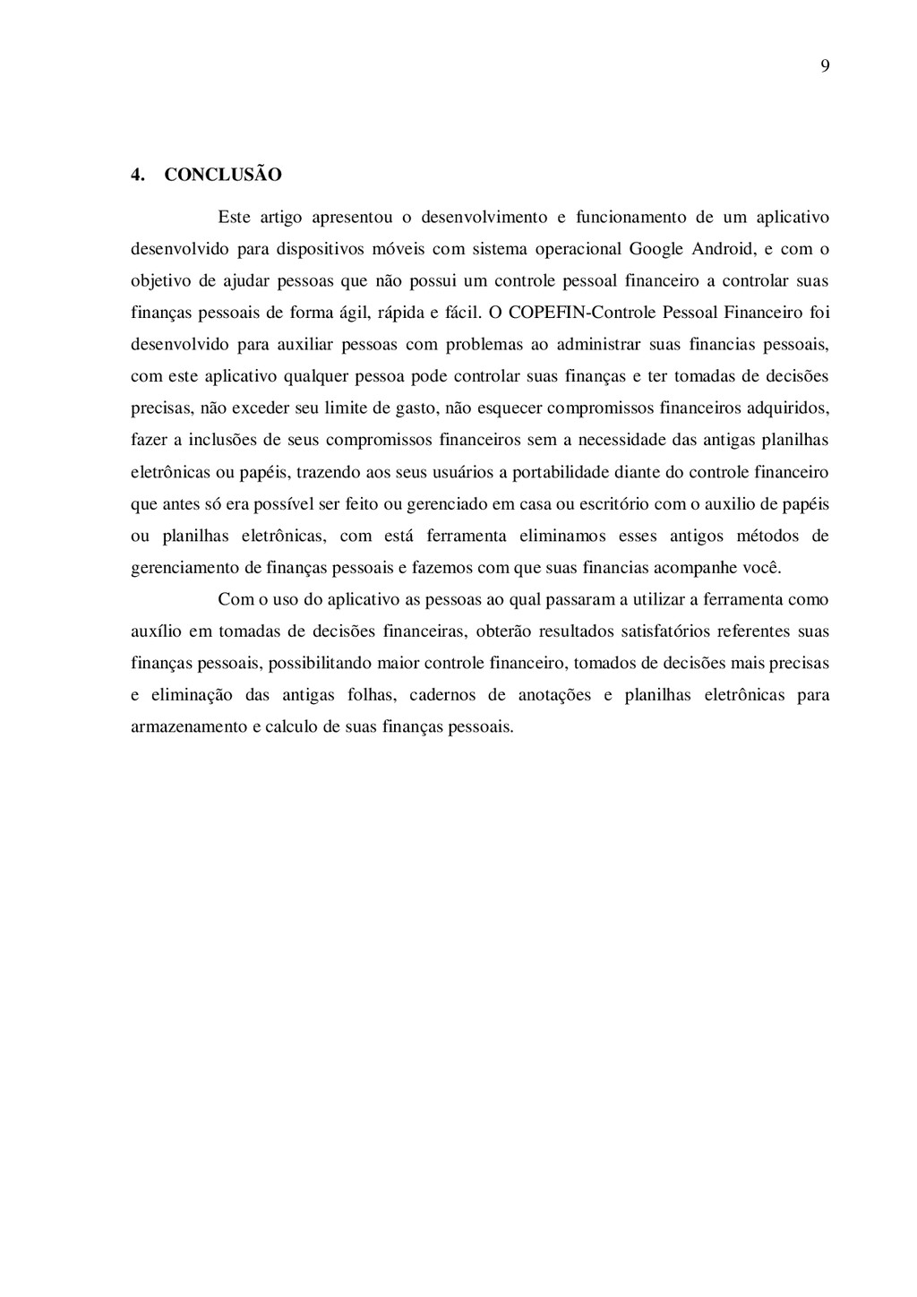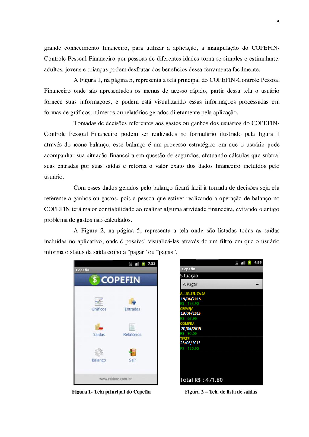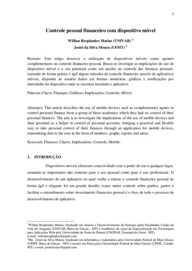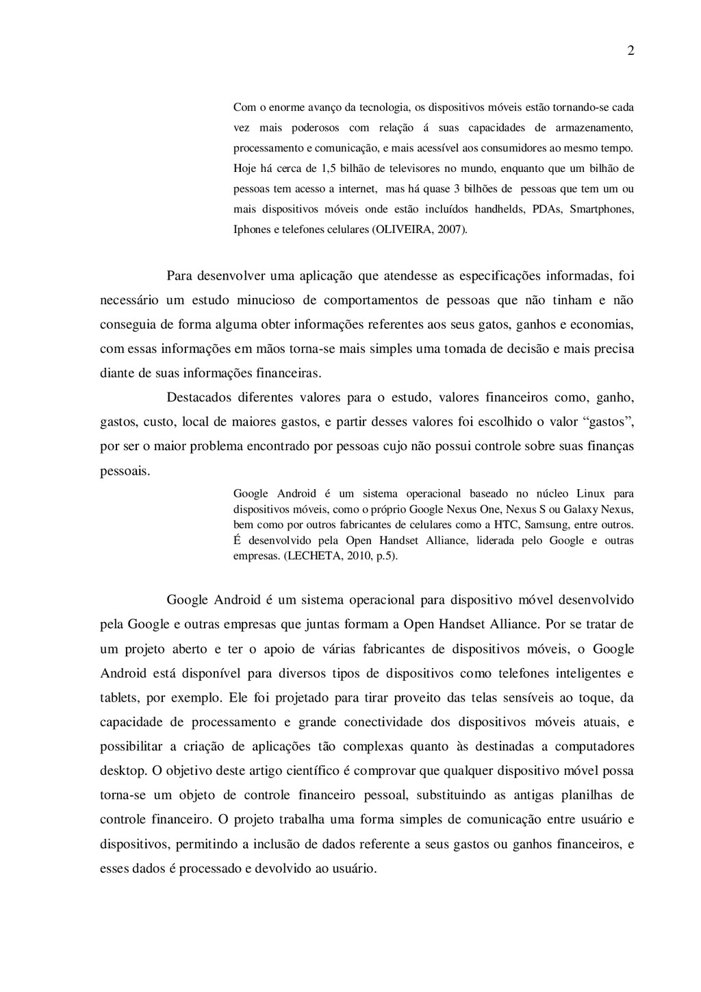 estão tornando-se cada vez mais poderosos com relação á suas capacidades de armazenamento, processamento e comunicação, e mais acessível aos consumidores ao mesmo tempo. Hoje há cerca de 1,5 bilhão de televisores no mundo, enquanto que um bilhão de pessoas tem acesso a internet, mas há quase 3 bilhões de pessoas que tem um ou mais dispositivos móveis onde estão incluídos handhelds, PDAs, Smartphones, Iphones e telefones celulares (OLIVEIRA, 2007). Para desenvolver uma aplicação que atendesse as especificações informadas, foi necessário um estudo minucioso de comportamentos de pessoas que não tinham e não conseguia de forma alguma obter informações referentes aos seus gatos, ganhos e economias, com essas informações em mãos torna-se mais simples uma tomada de decisão e mais precisa diante de suas informações financeiras. Destacados diferentes valores para o estudo, valores financeiros como, ganho, gastos, custo, local de maiores gastos, e partir desses valores foi escolhido o valor “gastos”, por ser o maior problema encontrado por pessoas cujo não possui controle sobre suas finanças pessoais. Google Android é um sistema operacional baseado no núcleo Linux para dispositivos móveis, como o próprio Google Nexus One, Nexus S ou Galaxy Nexus, bem como por outros fabricantes de celulares como a HTC, Samsung, entre outros. É desenvolvido pela Open Handset Alliance, liderada pelo Google e outras empresas. (LECHETA, 2010, p.5). Google Android é um sistema operacional para dispositivo móvel desenvolvido pela Google e outras empresas que juntas formam a Open Handset Alliance. Por se tratar de um projeto aberto e ter o apoio de várias fabricantes de dispositivos móveis, o Google Android está disponível para diversos tipos de dispositivos como telefones inteligentes e tablets, por exemplo. Ele foi projetado para tirar proveito das telas sensíveis ao toque, da capacidade de processamento e grande conectividade dos dispositivos móveis atuais, e possibilitar a criação de aplicações tão complexas quanto às destinadas a computadores desktop. O objetivo deste artigo científico é comprovar que qualquer dispositivo móvel possa torna-se um objeto de controle financeiro pessoal, substituindo as antigas planilhas de controle financeiro. O projeto trabalha uma forma simples de comunicação entre usuário e dispositivos, permitindo a inclusão de dados referente a seus gastos ou ganhos financeiros, e esses dados é processado e devolvido ao usuário.