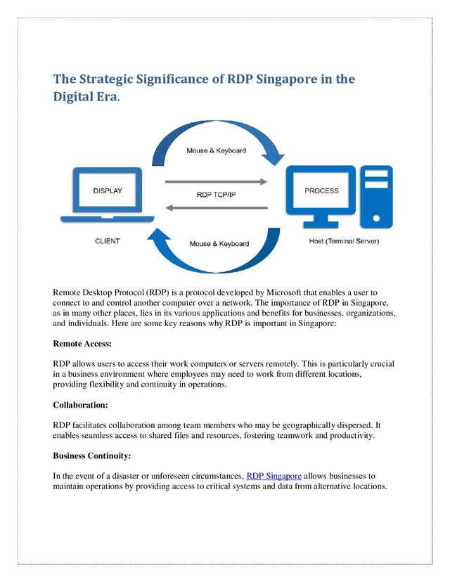 way to access sensitive information remotely. This is particularly important in Singapore, where data security and privacy are highly valued. IT Support: RDP is commonly used for IT support, allowing technicians to remotely troubleshoot and resolve issues on end-user devices without the need for physical presence. Cost Efficiency: RDP can lead to cost savings by reducing the need for extensive hardware infrastructure and travel expenses. Employees can connect to their work systems without the necessity of being physically present in the office. Global Connectivity: Singapore is a hub for international business, and RDP facilitates connectivity with offices, partners, and clients worldwide. It enables efficient communication and collaboration across borders. Virtualization: RDP plays a crucial role in virtualization environments, allowing users to connect to virtual machines or remote desktops hosted on servers, optimizing resource utilization and enhancing scalability. Economic Competitiveness: In the competitive business landscape of Singapore, efficient and secure remote access through RDP can contribute to the overall economic competitiveness of businesses by enabling agility and responsiveness to market demands. Government and Educational Institutions: RDP is utilized in various sectors, including government and education, for secure access to centralized systems and resources, supporting administrative and educational functions. In summary, RDP is important in Singapore as it facilitates remote access, collaboration, data security, and cost efficiency. Its widespread use contributes to the seamless operation of businesses, enhances connectivity, and supports the dynamic and competitive nature of Singapore's economic landscape.