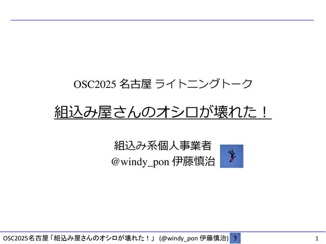 OSC2025名古屋 「組込み屋さんのオシロが壊れた!」 (@windy_pon 伊藤慎治) OSC2025 名古屋 ライトニングトーク 組込み屋さんのオシロが壊れた! 組込み系個人事業者 @windy_pon
