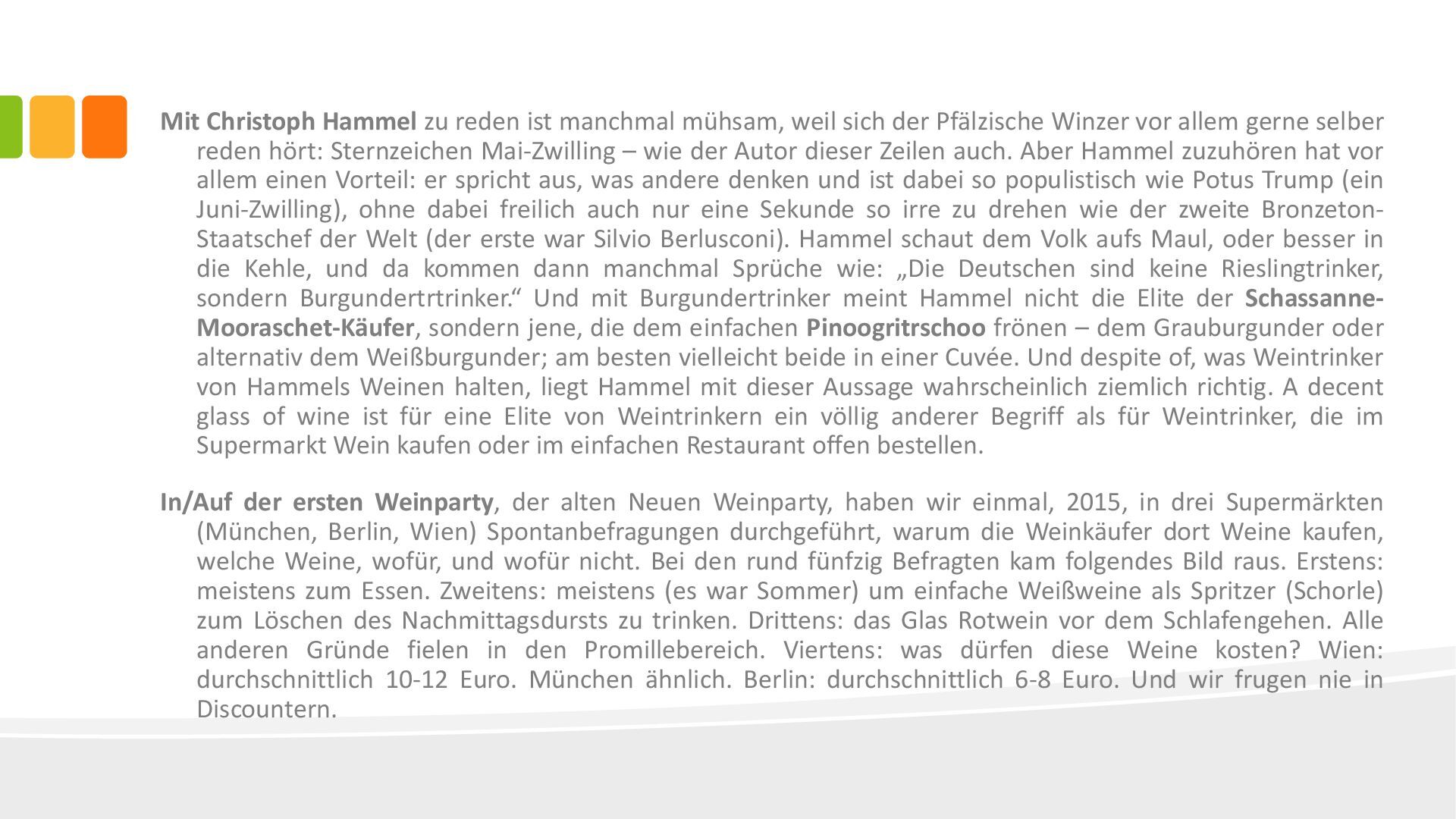 der Pfälzische Winzer vor allem gerne selber reden hört: Sternzeichen Mai-Zwilling – wie der Autor dieser Zeilen auch. Aber Hammel zuzuhören hat vor allem einen Vorteil: er spricht aus, was andere denken und ist dabei so populistisch wie Potus Trump (ein Juni-Zwilling), ohne dabei freilich auch nur eine Sekunde so irre zu drehen wie der zweite Bronzeton- Staatschef der Welt (der erste war Silvio Berlusconi). Hammel schaut dem Volk aufs Maul, oder besser in die Kehle, und da kommen dann manchmal Sprüche wie: „Die Deutschen sind keine Rieslingtrinker, sondern Burgundertrtrinker.“ Und mit Burgundertrinker meint Hammel nicht die Elite der Schassanne- Mooraschet-Käufer, sondern jene, die dem einfachen Pinoogritrschoo frönen – dem Grauburgunder oder alternativ dem Weißburgunder; am besten vielleicht beide in einer Cuvée. Und despite of, was Weintrinker von Hammels Weinen halten, liegt Hammel mit dieser Aussage wahrscheinlich ziemlich richtig. A decent glass of wine ist für eine Elite von Weintrinkern ein völlig anderer Begriff als für Weintrinker, die im Supermarkt Wein kaufen oder im einfachen Restaurant offen bestellen. In/Auf der ersten Weinparty, der alten Neuen Weinparty, haben wir einmal, 2015, in drei Supermärkten (München, Berlin, Wien) Spontanbefragungen durchgeführt, warum die Weinkäufer dort Weine kaufen, welche Weine, wofür, und wofür nicht. Bei den rund fünfzig Befragten kam folgendes Bild raus. Erstens: meistens zum Essen. Zweitens: meistens (es war Sommer) um einfache Weißweine als Spritzer (Schorle) zum Löschen des Nachmittagsdursts zu trinken. Drittens: das Glas Rotwein vor dem Schlafengehen. Alle anderen Gründe fielen in den Promillebereich. Viertens: was dürfen diese Weine kosten? Wien: durchschnittlich 10-12 Euro. München ähnlich. Berlin: durchschnittlich 6-8 Euro. Und wir frugen nie in Discountern.