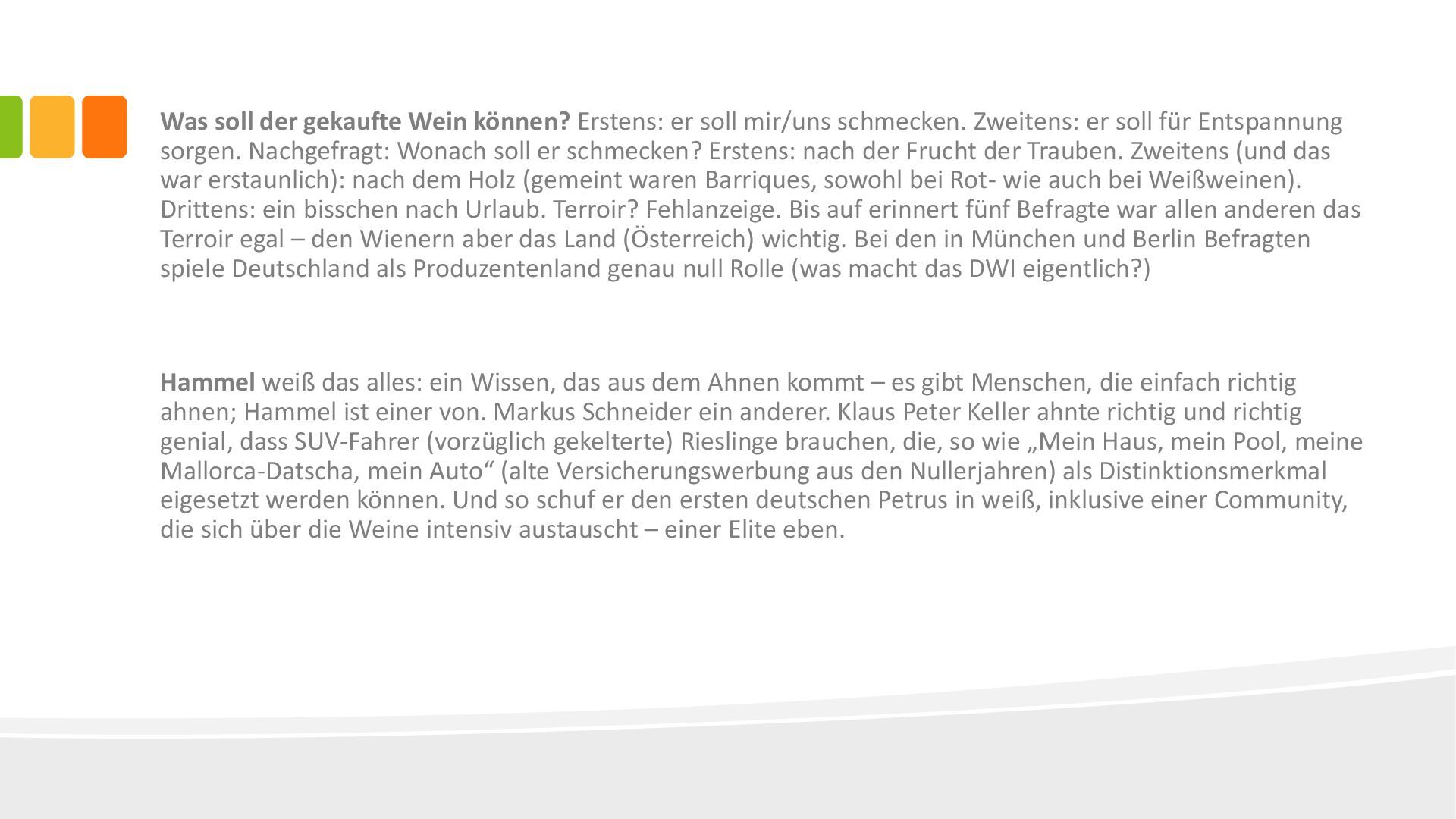 schmecken. Zweitens: er soll für Entspannung sorgen. Nachgefragt: Wonach soll er schmecken? Erstens: nach der Frucht der Trauben. Zweitens (und das war erstaunlich): nach dem Holz (gemeint waren Barriques, sowohl bei Rot- wie auch bei Weißweinen). Drittens: ein bisschen nach Urlaub. Terroir? Fehlanzeige. Bis auf erinnert fünf Befragte war allen anderen das Terroir egal – den Wienern aber das Land (Österreich) wichtig. Bei den in München und Berlin Befragten spiele Deutschland als Produzentenland genau null Rolle (was macht das DWI eigentlich?) Hammel weiß das alles: ein Wissen, das aus dem Ahnen kommt – es gibt Menschen, die einfach richtig ahnen; Hammel ist einer von. Markus Schneider ein anderer. Klaus Peter Keller ahnte richtig und richtig genial, dass SUV-Fahrer (vorzüglich gekelterte) Rieslinge brauchen, die, so wie „Mein Haus, mein Pool, meine Mallorca-Datscha, mein Auto“ (alte Versicherungswerbung aus den Nullerjahren) als Distinktionsmerkmal eigesetzt werden können. Und so schuf er den ersten deutschen Petrus in weiß, inklusive einer Community, die sich über die Weine intensiv austauscht – einer Elite eben.