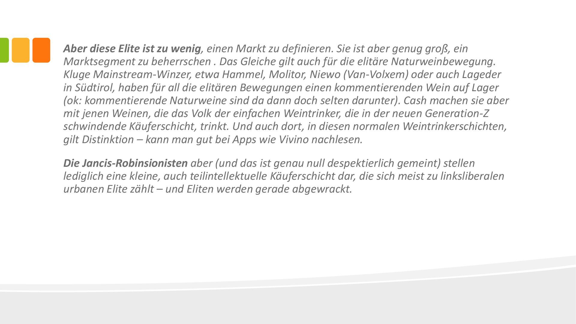 Sie ist aber genug groß, ein Marktsegment zu beherrschen . Das Gleiche gilt auch für die elitäre Naturweinbewegung. Kluge Mainstream-Winzer, etwa Hammel, Molitor, Niewo (Van-Volxem) oder auch Lageder in Südtirol, haben für all die elitären Bewegungen einen kommentierenden Wein auf Lager (ok: kommentierende Naturweine sind da dann doch selten darunter). Cash machen sie aber mit jenen Weinen, die das Volk der einfachen Weintrinker, die in der neuen Generation-Z schwindende Käuferschicht, trinkt. Und auch dort, in diesen normalen Weintrinkerschichten, gilt Distinktion – kann man gut bei Apps wie Vivino nachlesen. Die Jancis-Robinsionisten aber (und das ist genau null despektierlich gemeint) stellen lediglich eine kleine, auch teilintellektuelle Käuferschicht dar, die sich meist zu linksliberalen urbanen Elite zählt – und Eliten werden gerade abgewrackt.