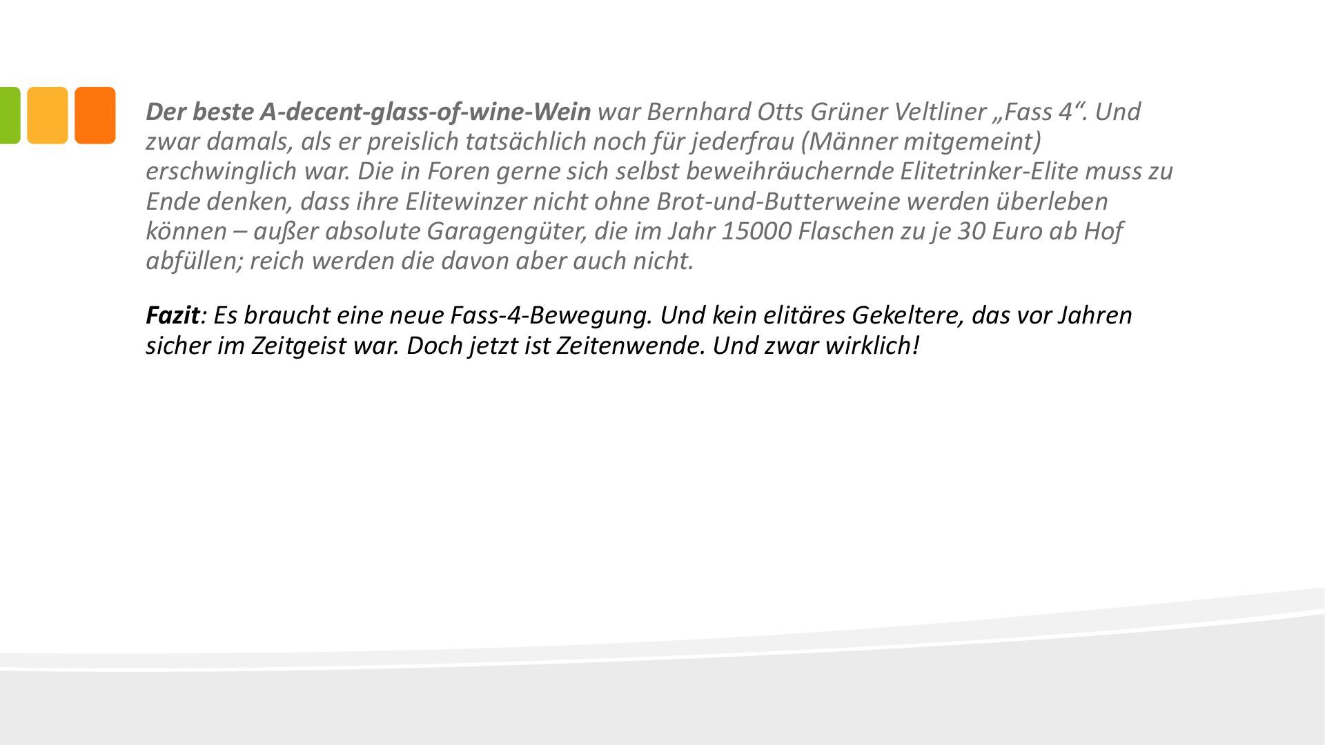 Und zwar damals, als er preislich tatsächlich noch für jederfrau (Männer mitgemeint) erschwinglich war. Die in Foren gerne sich selbst beweihräuchernde Elitetrinker-Elite muss zu Ende denken, dass ihre Elitewinzer nicht ohne Brot-und-Butterweine werden überleben können – außer absolute Garagengüter, die im Jahr 15000 Flaschen zu je 30 Euro ab Hof abfüllen; reich werden die davon aber auch nicht. Fazit: Es braucht eine neue Fass-4-Bewegung. Und kein elitäres Gekeltere, das vor Jahren sicher im Zeitgeist war. Doch jetzt ist Zeitenwende. Und zwar wirklich!