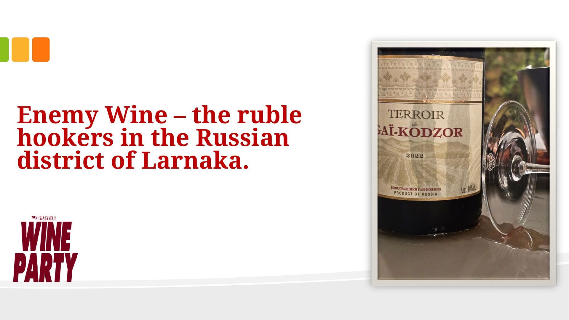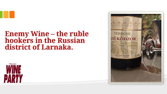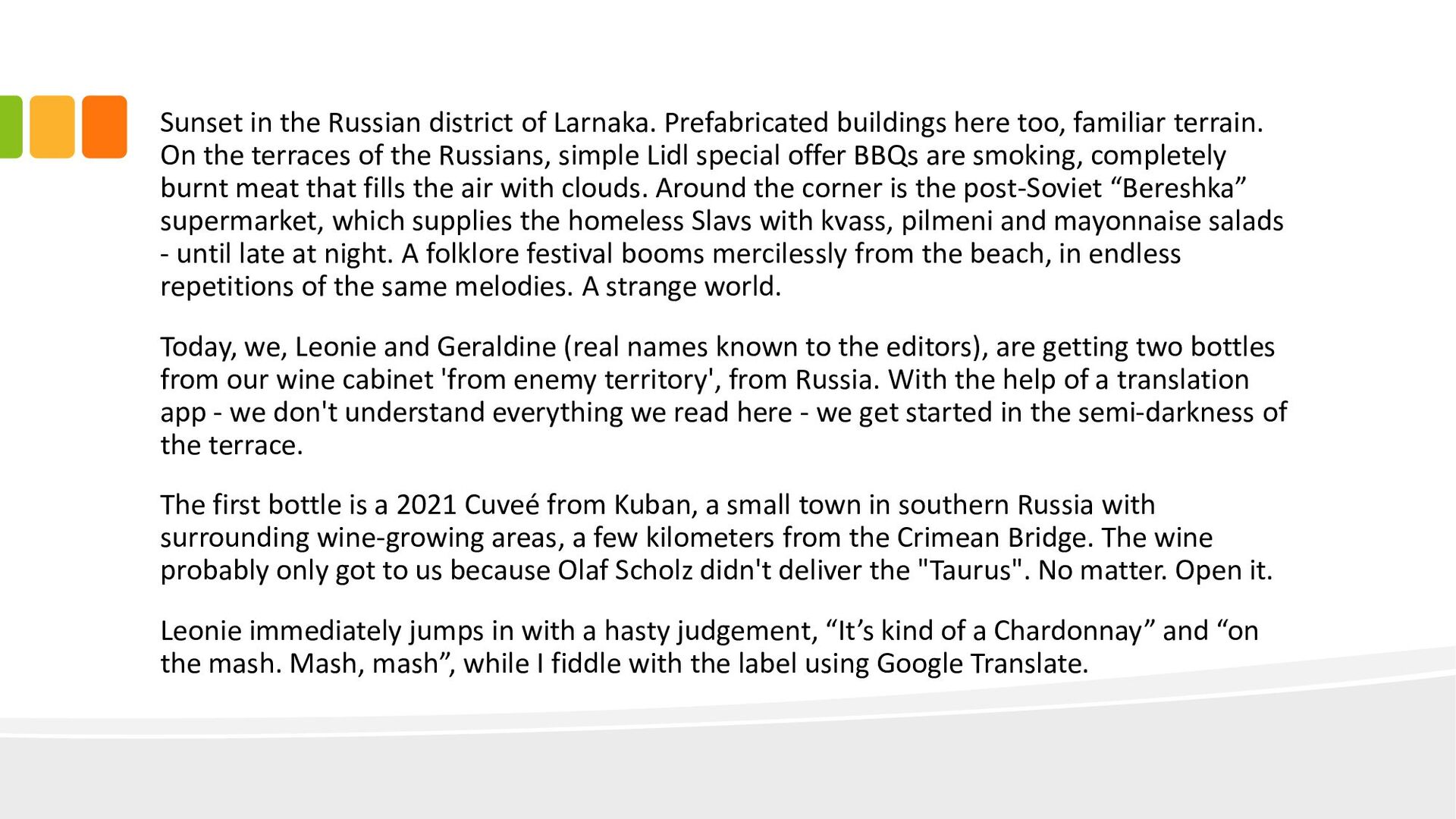 too, familiar terrain. On the terraces of the Russians, simple Lidl special offer BBQs are smoking, completely burnt meat that fills the air with clouds. Around the corner is the post-Soviet “Bereshka” supermarket, which supplies the homeless Slavs with kvass, pilmeni and mayonnaise salads - until late at night. A folklore festival booms mercilessly from the beach, in endless repetitions of the same melodies. A strange world. Today, we, Leonie and Geraldine (real names known to the editors), are getting two bottles from our wine cabinet 'from enemy territory', from Russia. With the help of a translation app - we don't understand everything we read here - we get started in the semi-darkness of the terrace. The first bottle is a 2021 Cuveé from Kuban, a small town in southern Russia with surrounding wine-growing areas, a few kilometers from the Crimean Bridge. The wine probably only got to us because Olaf Scholz didn't deliver the "Taurus". No matter. Open it. Leonie immediately jumps in with a hasty judgement, “It’s kind of a Chardonnay” and “on the mash. Mash, mash”, while I fiddle with the label using Google Translate.