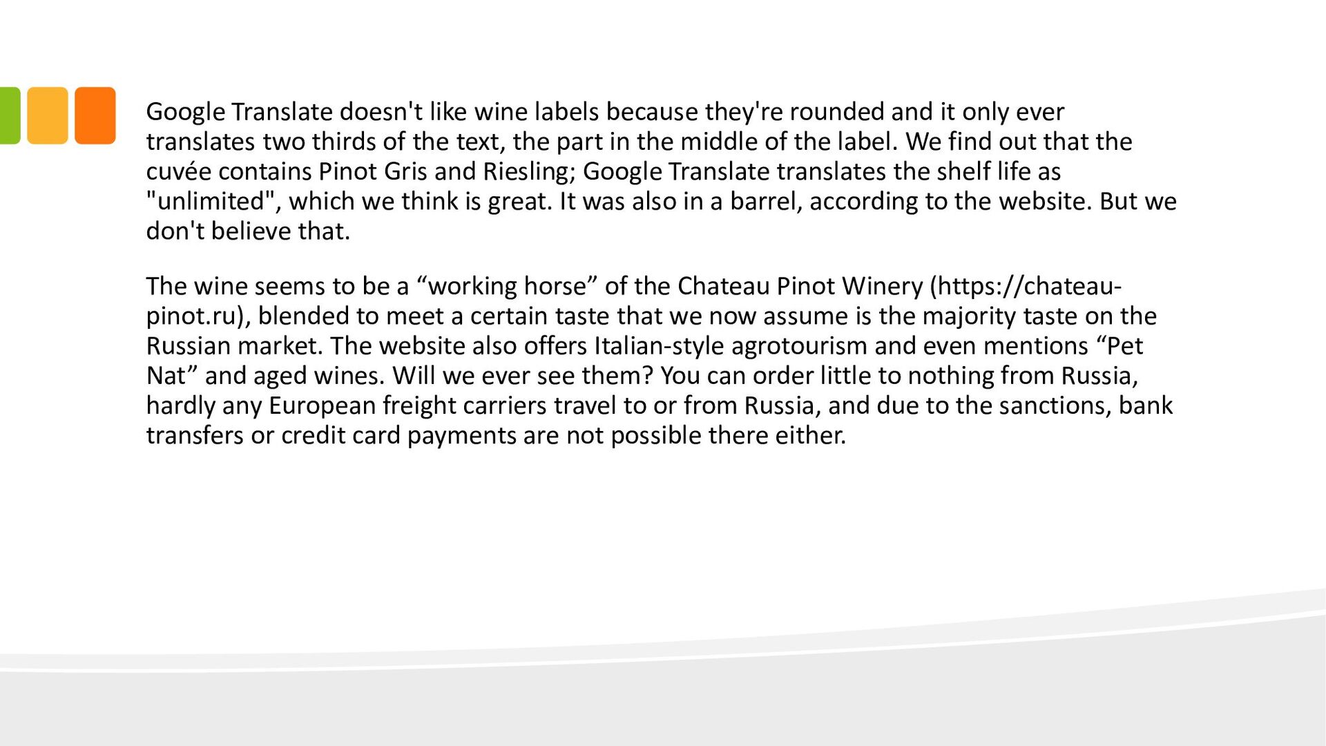 it only ever translates two thirds of the text, the part in the middle of the label. We find out that the cuvée contains Pinot Gris and Riesling; Google Translate translates the shelf life as "unlimited", which we think is great. It was also in a barrel, according to the website. But we don't believe that. The wine seems to be a “working horse” of the Chateau Pinot Winery (https://chateau- pinot.ru), blended to meet a certain taste that we now assume is the majority taste on the Russian market. The website also offers Italian-style agrotourism and even mentions “Pet Nat” and aged wines. Will we ever see them? You can order little to nothing from Russia, hardly any European freight carriers travel to or from Russia, and due to the sanctions, bank transfers or credit card payments are not possible there either.