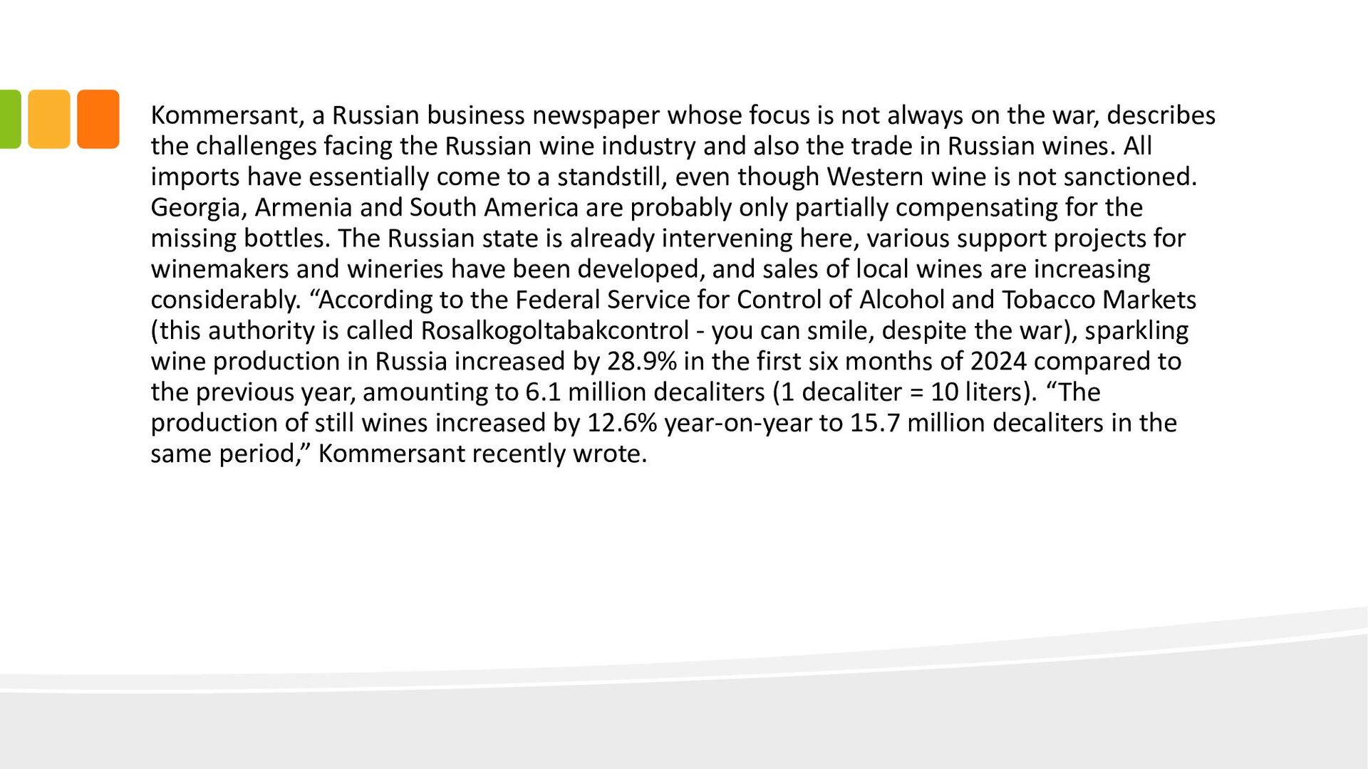 on the war, describes the challenges facing the Russian wine industry and also the trade in Russian wines. All imports have essentially come to a standstill, even though Western wine is not sanctioned. Georgia, Armenia and South America are probably only partially compensating for the missing bottles. The Russian state is already intervening here, various support projects for winemakers and wineries have been developed, and sales of local wines are increasing considerably. “According to the Federal Service for Control of Alcohol and Tobacco Markets (this authority is called Rosalkogoltabakcontrol - you can smile, despite the war), sparkling wine production in Russia increased by 28.9% in the first six months of 2024 compared to the previous year, amounting to 6.1 million decaliters (1 decaliter = 10 liters). “The production of still wines increased by 12.6% year-on-year to 15.7 million decaliters in the same period,” Kommersant recently wrote.