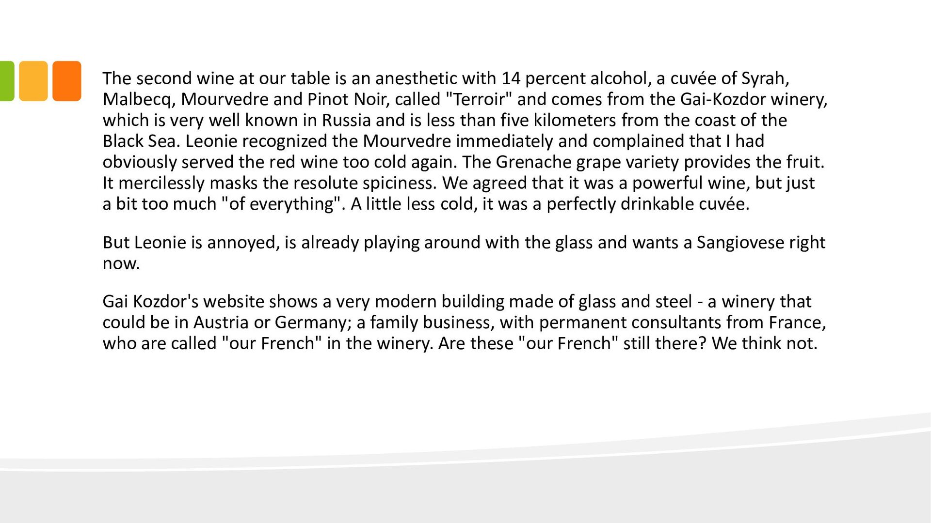 14 percent alcohol, a cuvée of Syrah, Malbecq, Mourvedre and Pinot Noir, called "Terroir" and comes from the Gai-Kozdor winery, which is very well known in Russia and is less than five kilometers from the coast of the Black Sea. Leonie recognized the Mourvedre immediately and complained that I had obviously served the red wine too cold again. The Grenache grape variety provides the fruit. It mercilessly masks the resolute spiciness. We agreed that it was a powerful wine, but just a bit too much "of everything". A little less cold, it was a perfectly drinkable cuvée. But Leonie is annoyed, is already playing around with the glass and wants a Sangiovese right now. Gai Kozdor's website shows a very modern building made of glass and steel - a winery that could be in Austria or Germany; a family business, with permanent consultants from France, who are called "our French" in the winery. Are these "our French" still there? We think not.