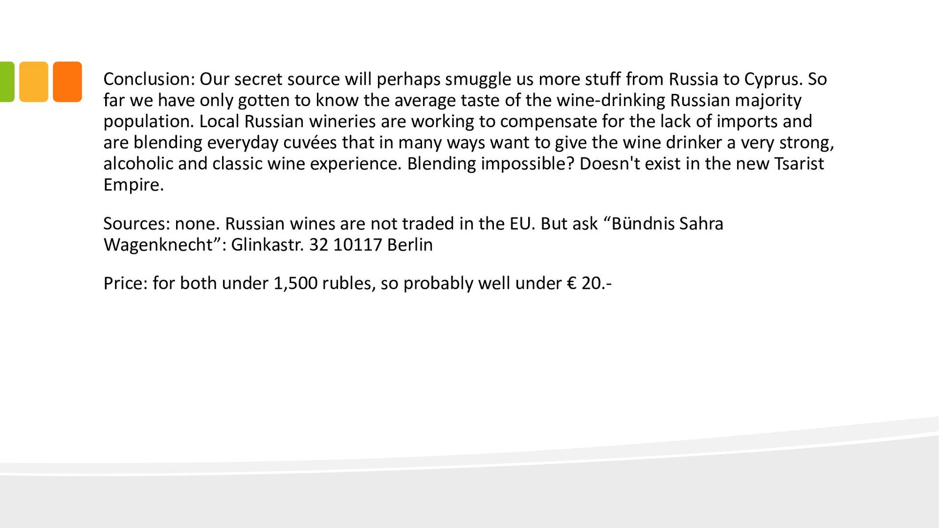 from Russia to Cyprus. So far we have only gotten to know the average taste of the wine-drinking Russian majority population. Local Russian wineries are working to compensate for the lack of imports and are blending everyday cuvées that in many ways want to give the wine drinker a very strong, alcoholic and classic wine experience. Blending impossible? Doesn't exist in the new Tsarist Empire. Sources: none. Russian wines are not traded in the EU. But ask “Bündnis Sahra Wagenknecht”: Glinkastr. 32 10117 Berlin Price: for both under 1,500 rubles, so probably well under € 20.-
