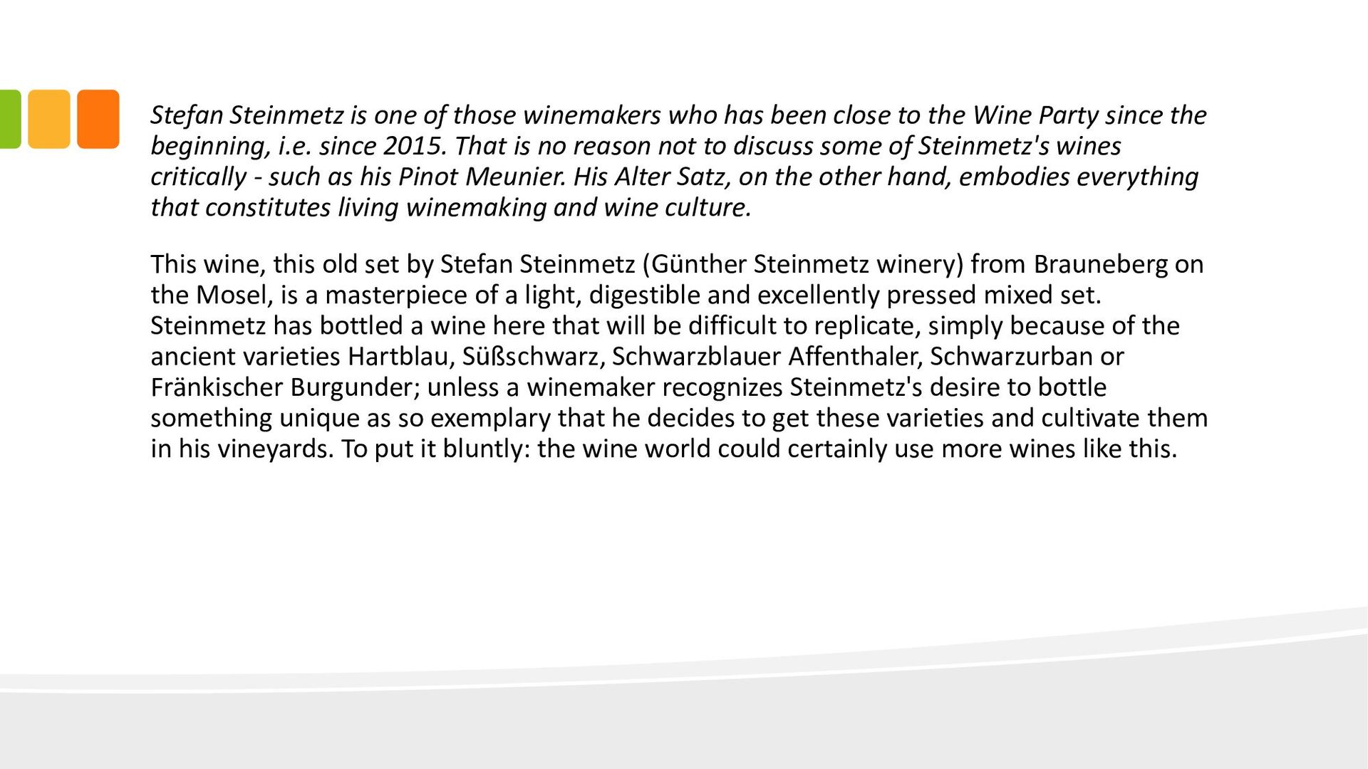 close to the Wine Party since the beginning, i.e. since 2015. That is no reason not to discuss some of Steinmetz's wines critically - such as his Pinot Meunier. His Alter Satz, on the other hand, embodies everything that constitutes living winemaking and wine culture. This wine, this old set by Stefan Steinmetz (Günther Steinmetz winery) from Brauneberg on the Mosel, is a masterpiece of a light, digestible and excellently pressed mixed set. Steinmetz has bottled a wine here that will be difficult to replicate, simply because of the ancient varieties Hartblau, Süßschwarz, Schwarzblauer Affenthaler, Schwarzurban or Fränkischer Burgunder; unless a winemaker recognizes Steinmetz's desire to bottle something unique as so exemplary that he decides to get these varieties and cultivate them in his vineyards. To put it bluntly: the wine world could certainly use more wines like this.