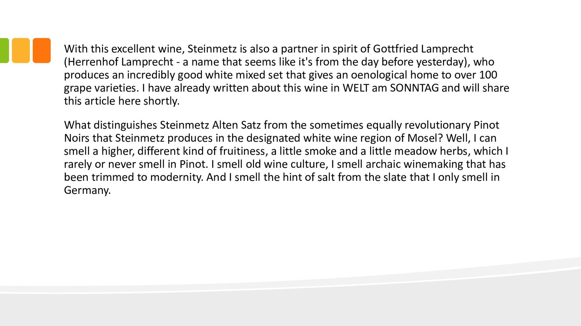 spirit of Gottfried Lamprecht (Herrenhof Lamprecht - a name that seems like it's from the day before yesterday), who produces an incredibly good white mixed set that gives an oenological home to over 100 grape varieties. I have already written about this wine in WELT am SONNTAG and will share this article here shortly. What distinguishes Steinmetz Alten Satz from the sometimes equally revolutionary Pinot Noirs that Steinmetz produces in the designated white wine region of Mosel? Well, I can smell a higher, different kind of fruitiness, a little smoke and a little meadow herbs, which I rarely or never smell in Pinot. I smell old wine culture, I smell archaic winemaking that has been trimmed to modernity. And I smell the hint of salt from the slate that I only smell in Germany.