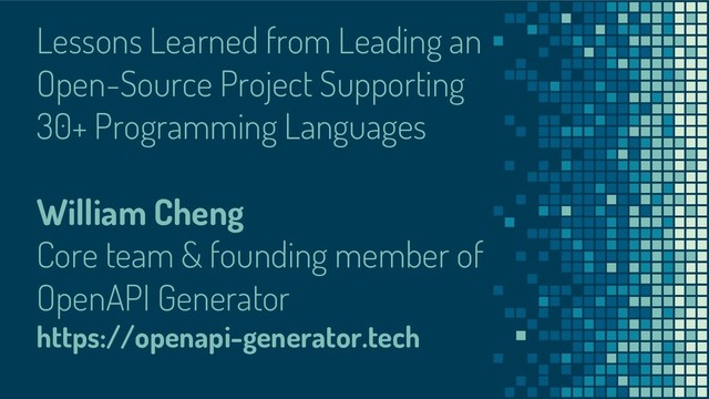 Swagger Codegen, which is an open-source code generator for REST API, has become very popular in recent years. Many companies, from start-ups to IT conglomerates such as Cisco, IBM, VMWare, are using it in production to streamline the development process. The project covers a wide range of programming languages and server-side frameworks. How does the project grow from less than 50 contributors to 850+ contributors from all around the world with 10000+ commits in 4 years? William Cheng, the top contributor of Swagger Codegen, will share the journey the community went through and the lessons learned from building a vibrant developer community.
