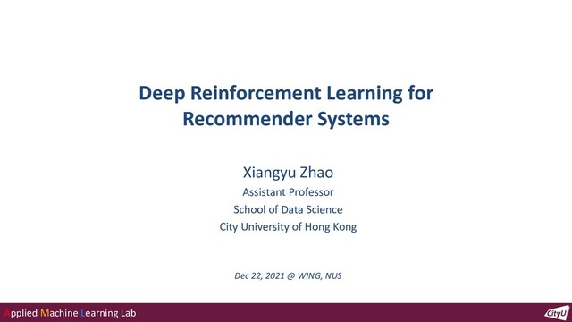 Recommender systems have become increasingly important in our daily lives since they play an important role in mitigating the information overload problem, especially in many user-oriented online services. Most recommender systems consider the recommendation procedure as a static process and make recommendations following a fixed greedy strategy, which may fail given the dynamic nature of the users’ preferences. Also, they are designed to maximize the immediate reward of recommendations, while completely overlooking their long-term influence on user experiments. To learn adaptive recommendation policy, we will consider the recommendation procedure as sequential interactions between users and recommender agents; and leverage Reinforcement Learning (RL) to automatically learn an optimal recommendation strategy (policy) that maximizes cumulative rewards from users without any specific instructions. Recommender systems based on reinforcement learning have two advantages. First, they can continuously update their strategies during the interactions. Second, the optimal strategy is made by maximizing the expected long-term cumulative reward from users. This talk will introduce the fundamentals and advances of deep reinforcement learning and its applications in recommender systems.