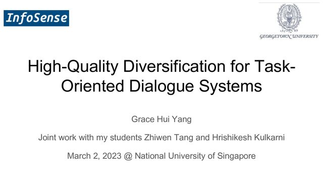 Speaker's bio: Dr. Grace Hui Yang is an Associate Professor in the Department of Computer Science at Georgetown University. Dr. Yang is leading the InfoSense (Information Retrieval and Sense-Making) group at Georgetown University, Washington D.C. Dr. Yang obtained her Ph.D. from Carnegie Mellon University in 2011. Her current research interests include deep reinforcement learning, interactive agents, and human-centered AI. Prior to this, she conducted research on question answering, automatic ontology construction, near-duplicate detection, multimedia information retrieval, and opinion and sentiment detection. Dr. Yang's research has been supported by the Defense Advanced Research Projects Agency (DARPA) and the National Science Foundation (NSF). Dr. Yang co-organized the Text Retrieval Conference (TREC) Dynamic Domain Track from 2015 to 2017 and led the effort for SIGIR privacy-preserving information retrieval workshops from 2014 to 2016. Dr. Yang has served on the editorial boards of ACM TOIS and Information Retrieval Journal (from 2014 to 2017) and has actively served as an organizing or program committee member in many conferences such as SIGIR, ECIR, ACL, AAAI, ICTIR, CIKM, WSDM, and WWW. She is a recipient of the NSF Faculty Early Career Development Program (CAREER) Award.