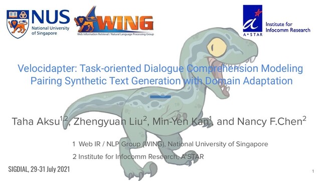 Taha Aksu, Zhengyuan Liu, Min-Yen Kan, Nancy F. Chen (2021) "Velocidapter: Task-oriented Dialogue Comprehension Modeling Pairing Synthetic Text Generation with Domain Adaptation."