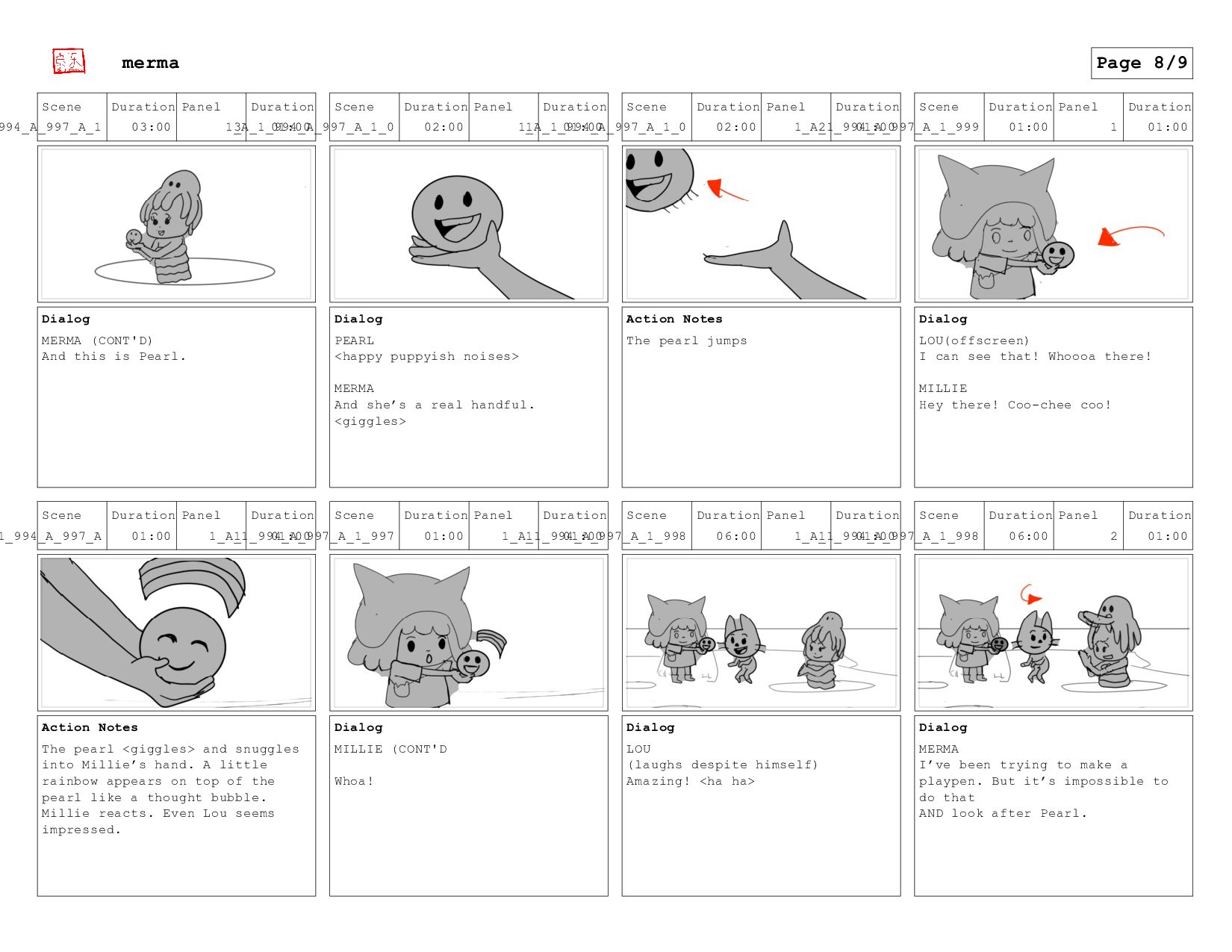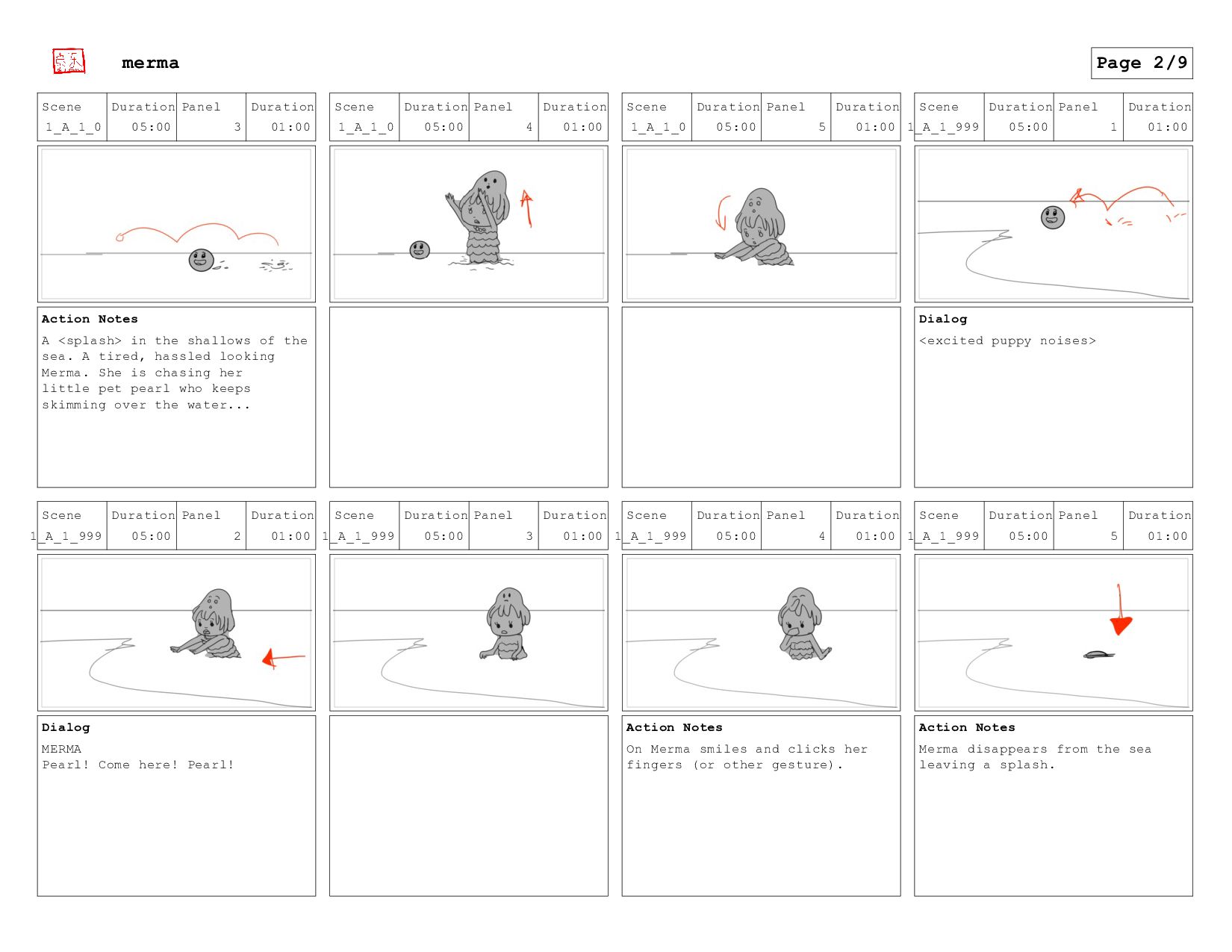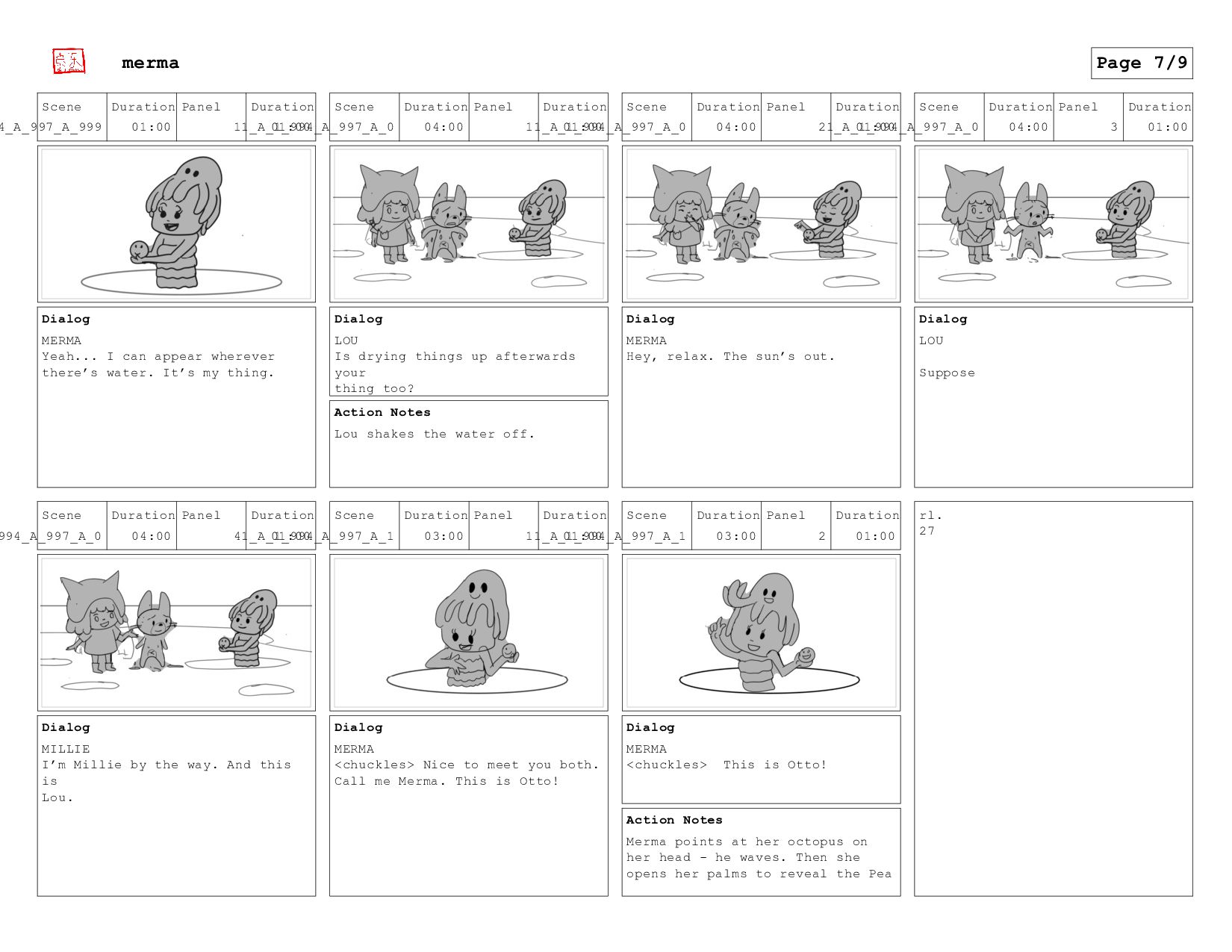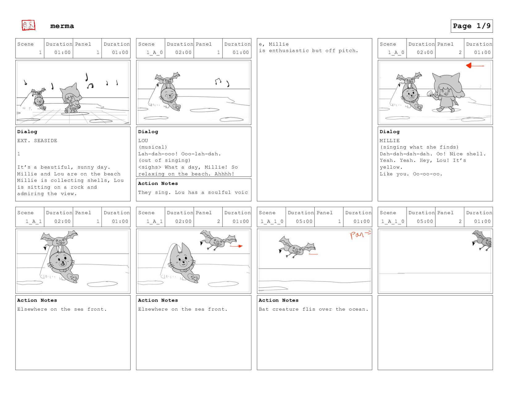 SEASIDE 1 It’s a beautiful, sunny day. Millie and Lou are on the beach Millie is collecting shells, Lou is sitting on a rock and admiring the view. Scene 1_A_0 Duration 02:00 Panel 1 Duration 01:00 Dialog LOU (musical) Lah-dah-ooo! Ooo-lah-dah. (out of singing) <sighs> What a day, Millie! So relaxing on the beach. Ahhhh! Action Notes They sing. Lou has a soulful voic e, Millie is enthusiastic but off pitch. Scene 1_A_0 Duration 02:00 Panel 2 Duration 01:00 Dialog MILLIE (singing what she finds) Dah-dah-dah-dah. Oo! Nice shell. Yeah. Yeah. Hey, Lou! It’s yellow. Like you. Oo-oo-oo. Scene 1_A_1 Duration 02:00 Panel 1 Duration 01:00 Action Notes Elsewhere on the sea front. Scene 1_A_1 Duration 02:00 Panel 2 Duration 01:00 Action Notes Elsewhere on the sea front. Scene 1_A_1_0 Duration 05:00 Panel 1 Duration 01:00 Action Notes Bat creature flis over the ocean. Scene 1_A_1_0 Duration 05:00 Panel 2 Duration 01:00 merma Page 1/9