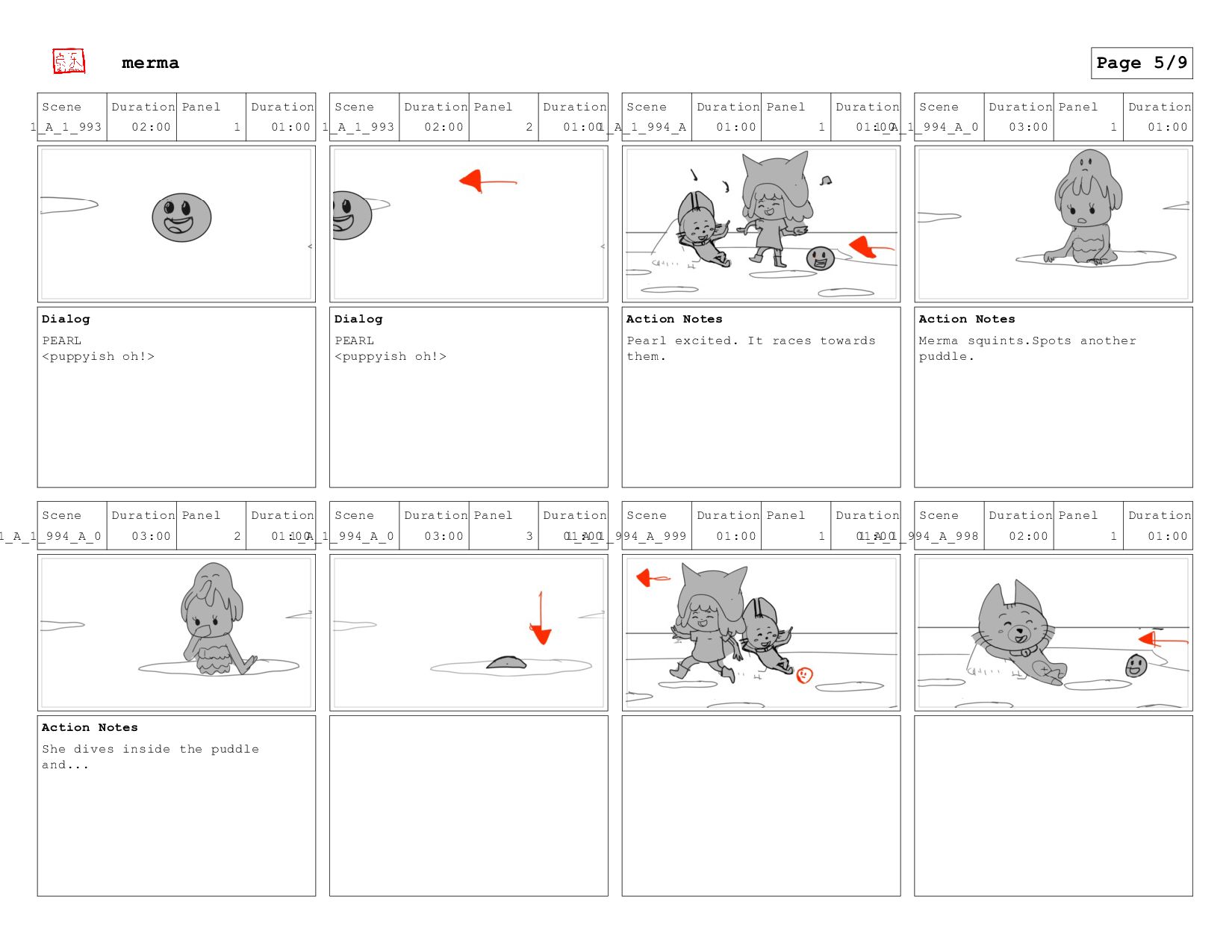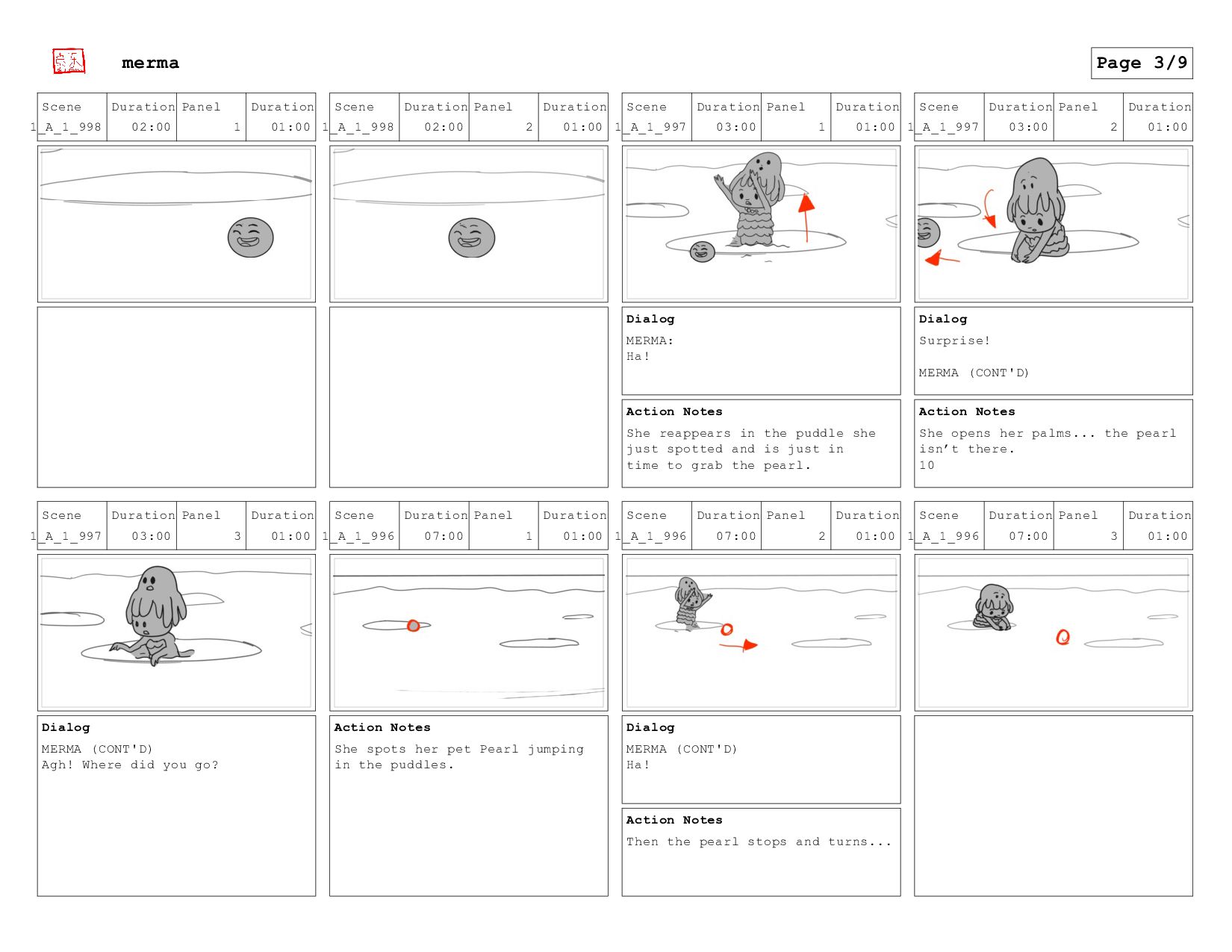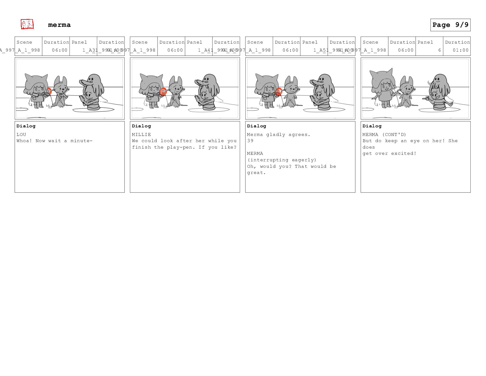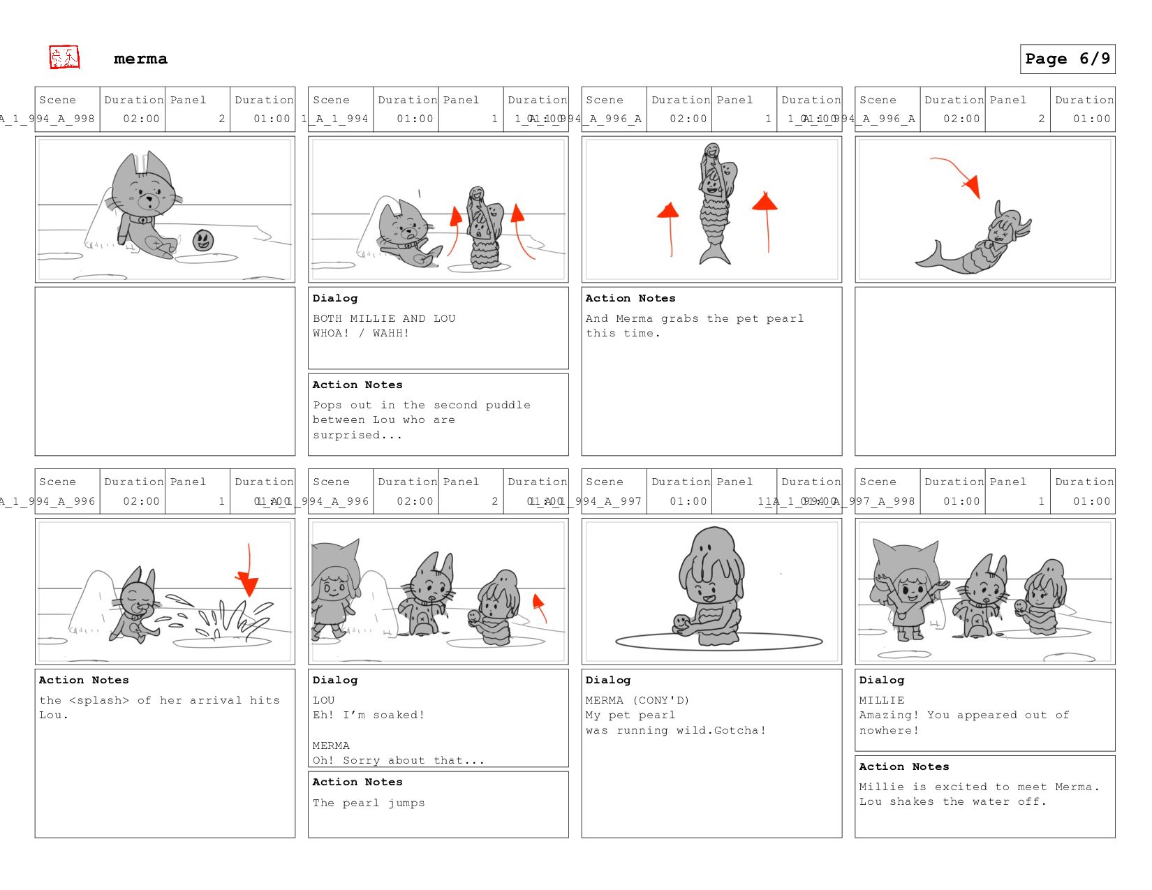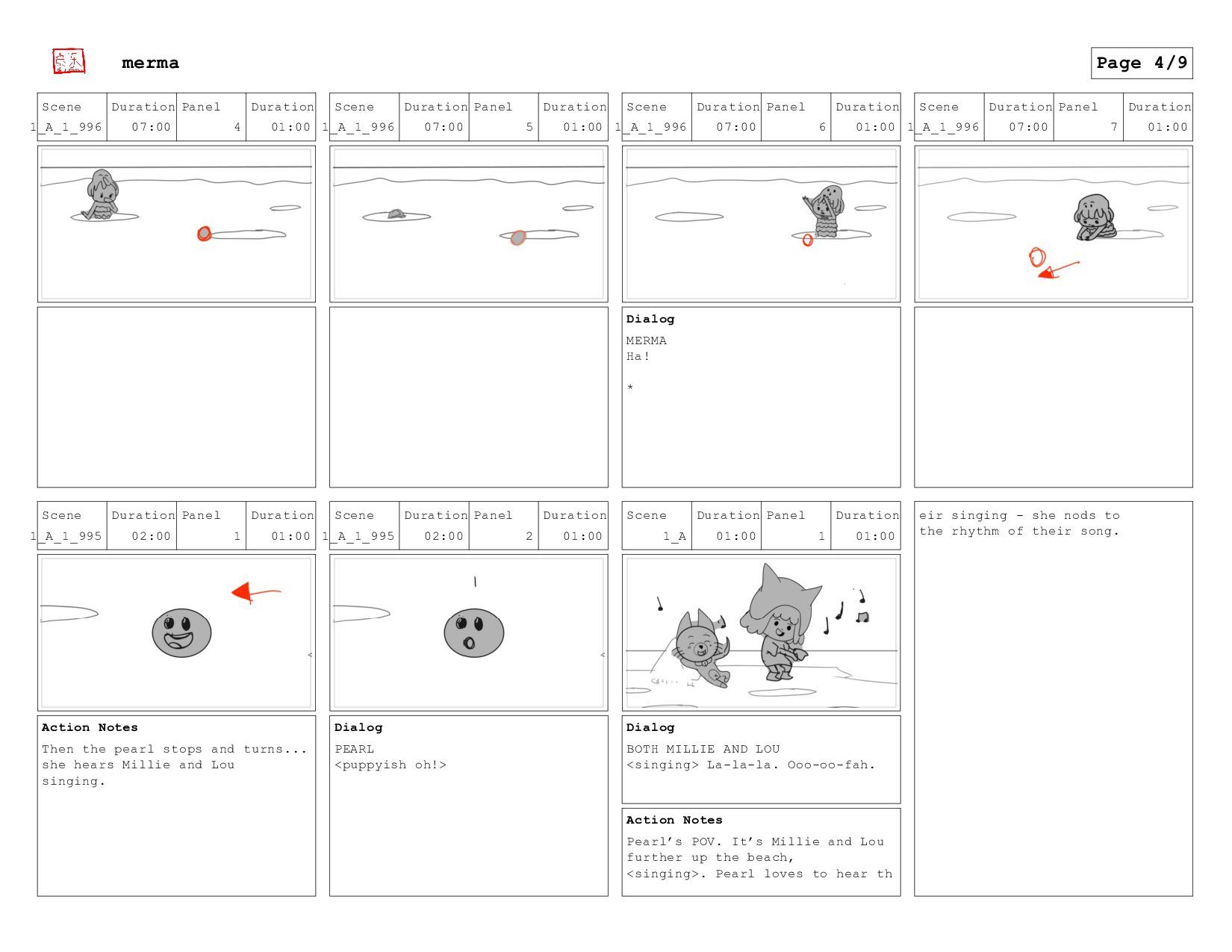 SEASIDE 1 It’s a beautiful, sunny day. Millie and Lou are on the beach Millie is collecting shells, Lou is sitting on a rock and admiring the view. Scene 1_A_0 Duration 02:00 Panel 1 Duration 01:00 Dialog LOU (musical) Lah-dah-ooo! Ooo-lah-dah. (out of singing) <sighs> What a day, Millie! So relaxing on the beach. Ahhhh! Action Notes They sing. Lou has a soulful voic e, Millie is enthusiastic but off pitch. Scene 1_A_0 Duration 02:00 Panel 2 Duration 01:00 Dialog MILLIE (singing what she finds) Dah-dah-dah-dah. Oo! Nice shell. Yeah. Yeah. Hey, Lou! It’s yellow. Like you. Oo-oo-oo. Scene 1_A_1 Duration 02:00 Panel 1 Duration 01:00 Action Notes Elsewhere on the sea front. Scene 1_A_1 Duration 02:00 Panel 2 Duration 01:00 Action Notes Elsewhere on the sea front. Scene 1_A_1_0 Duration 05:00 Panel 1 Duration 01:00 Action Notes Bat creature flis over the ocean. Scene 1_A_1_0 Duration 05:00 Panel 2 Duration 01:00 merma Page 1/9