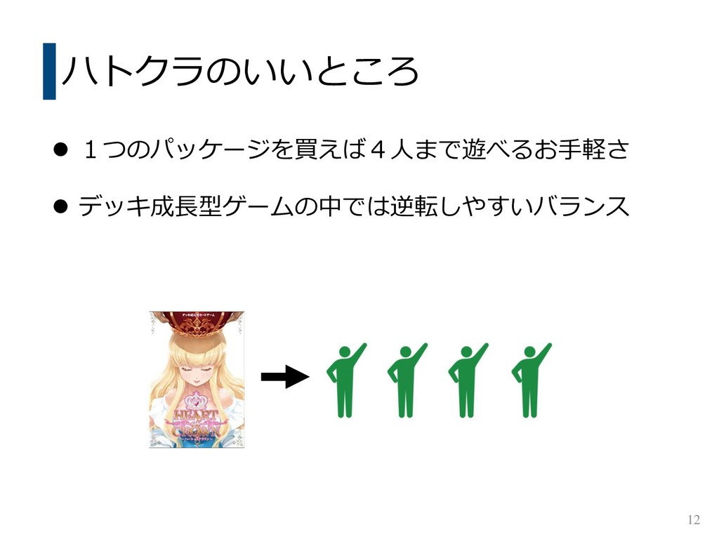 ⚫ 1つのパッケージを買えば4人まで遊べるお手軽さ ⚫ デッキ成長型ゲームの中では逆転しやすいバランス ハトクラのいいところ 12